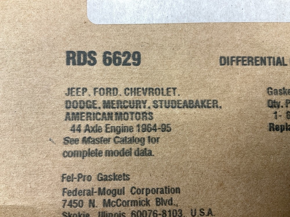 Fel-pro part number RDS6629. PLEASE NOTE: ORIGINAL FEL-PRO PACKAGING MAY BE TORN OR DISTRESSED. ALL GASKETS ARE GUARANTEED TO BE ORIGINAL FEL-PRO AND COMPLETE AS SHOWN. WE RESERVE THE RIGHT TO OPEN AND/OR VERIFY THE CONTENTS OF ANY GASKET SET. WE ALSO RESERVE THE RIGHT TO SHIP IN THE MOST ECONOMICAL WAY POSSIBLE BY ROLLING UP OR FOLDING OVER THE ORIGINAL PACKAGING WHERE APPLICABLE (EXAMPLE: RUBBER VALVE COVER GASKET). -- FRONT or REAR; 1964-95 Jeep, Ford, Chevrolet, Dodge, Mercury, Studeabaker, American Motors 44 Axle, 10 BOLT Free Shipping is for continental USA only. If you live in Alaska, Hawaii, or PR please contact us for a shipping quote before bidding. May contain shelf wear or imperfections due to the age of the product. Fitment: Applications are provided through literature and research and are correct to the best of our knowledge. Listed applications should be used as a guide and may fit additional vehicles. Please verify the part that you are ordering fits your application prior to purchase. Please contact us if you have any questions before purchasing. Shipping: Free Domestic Standard Shipping! Expedited shipping is available at an additional cost. Free shipping applies to continental United States only. Additional shipping and handling charges may apply for orders shipping to Hawaii, Alaska, Puerto Rico and all other US territories. International shipping is available. Contact us before purchasing and we will determine the best rate. Items are shipped the next business day after receiving full payment. Returns: We gladly accept returns 30 days after purchase. Items must be returned in the condition that they were sent for a full refund.
