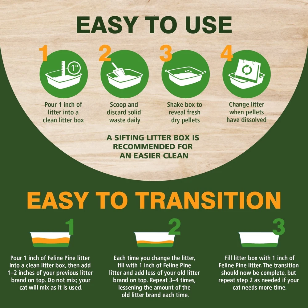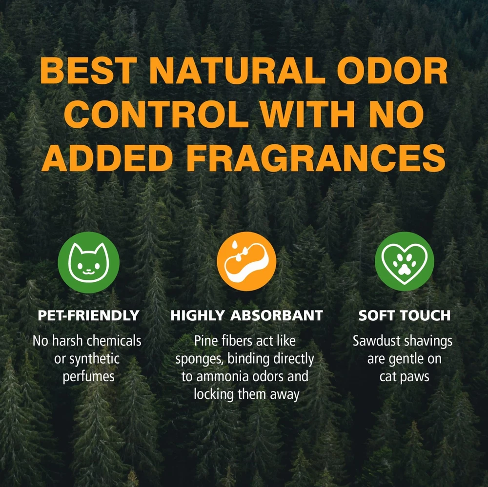 Feline Pine Platinum Non-Clumping Cat Litter, Feline Pine Cat Litter 18lb LIGHTWEIGHT CAT LITTER so changing and refilling the cat litter box is fast and easy. That’s easy because this absorbent non-clumping kitty litter is natural and less than half the weight of clay litter and leaves no messy cloud of dust. HIGHLY ABSORBENT PINE LOCKS AWAY ODORS: Feline Pine cat litter is a lightweight non-clumping cat litter that directly binds to odors like thousands of tiny sponges to soak up liquid and lock away ammonia odors to keep the litter box fresh and dry. A NATURAL CAT LITTER CHOICE. No new trees are cut down to make the pine shavings in Feline Pine Platinum Natural Pine Non-Clumping Litter. This unscented cat litter comes from kiln dried shavings reclaimed from lumber production, NO HARSH CHEMICALS, NO ADDED FRAGRANCE— This non clumping cat litter is an effective odor eliminator that’s made simple with plant-based ingredients like natural pine shavings, plus the absorbent power of ARM & HAMMER Baking Soda. Soda BEST NATURAL ODOR CONTROL. Naturally keep your kitty litter box fresh with natural pine fibers that lock away ammonia odors and neutralize odors on contact.Eliminate the toughest odors with plant-based ingredients instead of harsh chemicals or perfumes