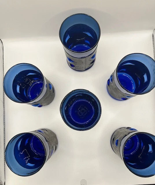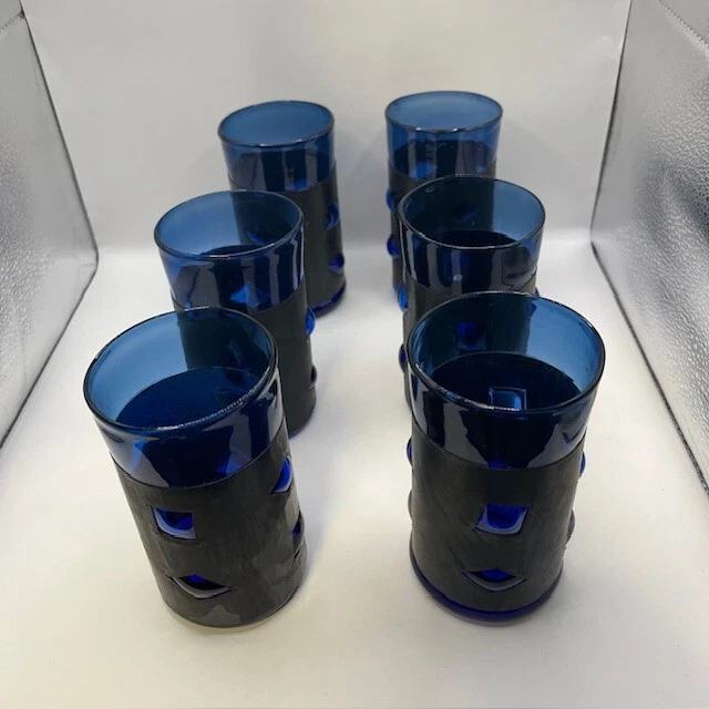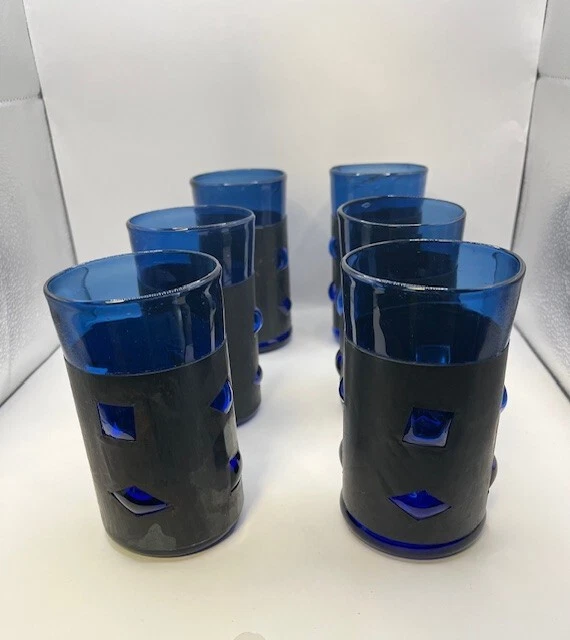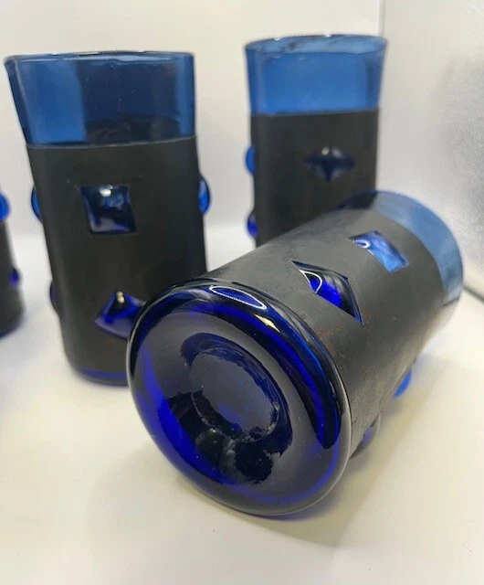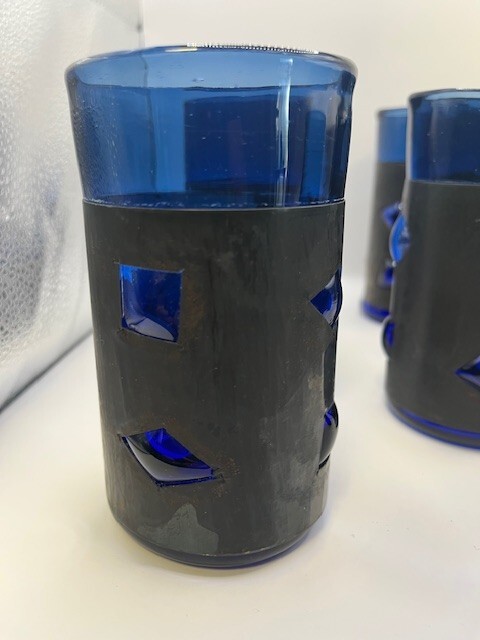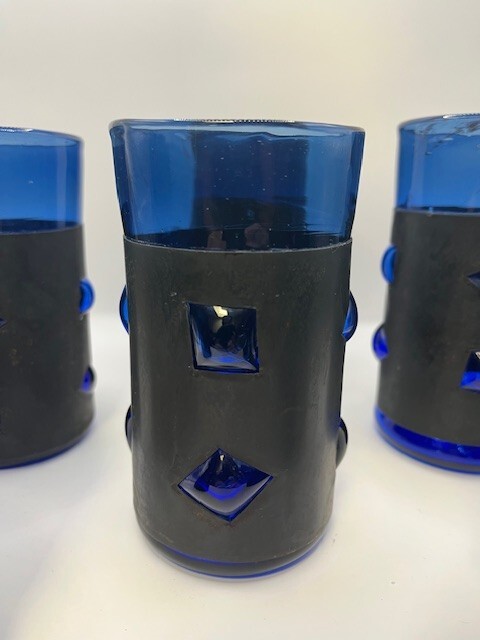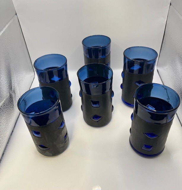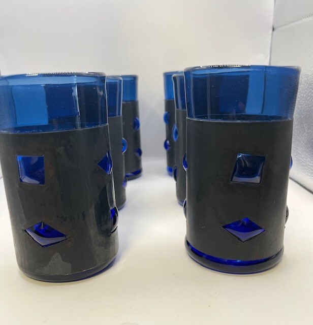 RARE full set of 6 Felipe Derflingher, Caged Blue, Double Rock Barware Set. Handblown Cobalt Blue Glass inside metal cage wrap with blown bubbled windows making a stunning 3D effect. This is true Brutalist Art Glass. Each Felipe Derflingher piece is a work of art with no two being exactly alike. The metal wrap shows a beautiful patina giving a stunning contrast to the blue glass. Highly collectable and rare to find a full set of 6! Glasses are in excellent vintage condition with no chips, cracks or discoloration. Pleaseview all photographs carefully as they are considered part of the item description. I'm an experienced glass shipper, so restassured, your item will arrive safely. Measurement (per glass) approximately 5 inches high 3 inches wide (at the mouth) Sold as set only