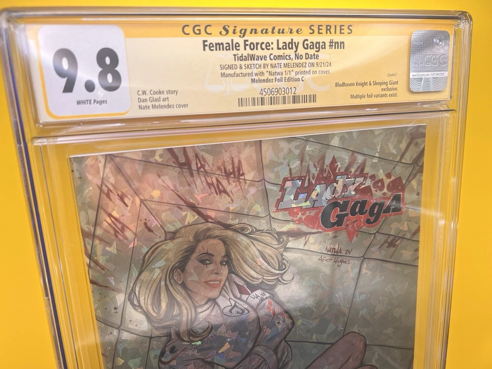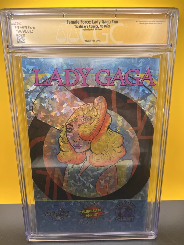 Get your hands on this stunning comic book featuring the iconic Lady Gaga on the cover. This single issue is a must-have for fans of US Comics, with a grade of 9.8 Near Mint/Mint and autograph authentication from Certified Guaranty Company (CGC). The comic book is personalized and comes with a variant cover, making it a unique addition to your collection. CCC/L-11/19/24 The issue number is 1 and it is from the Modern Age (1992-Now). The comic book is in English and features the superhero team A-Force, with a focus on women and adventure. This retailer exclusive variant is signed by the artist and comes with a certificate of authenticity. Don't miss out on this exciting opportunity to own a piece of comic book history.