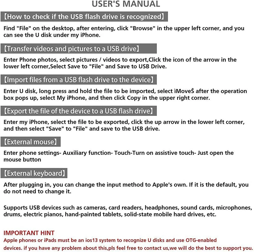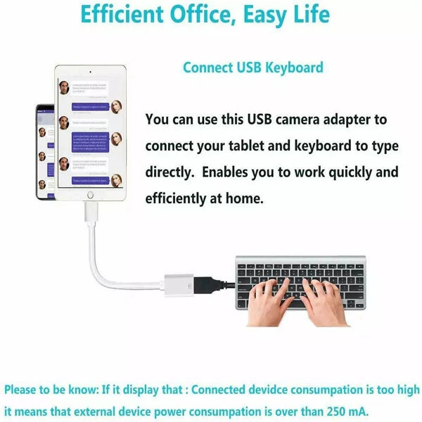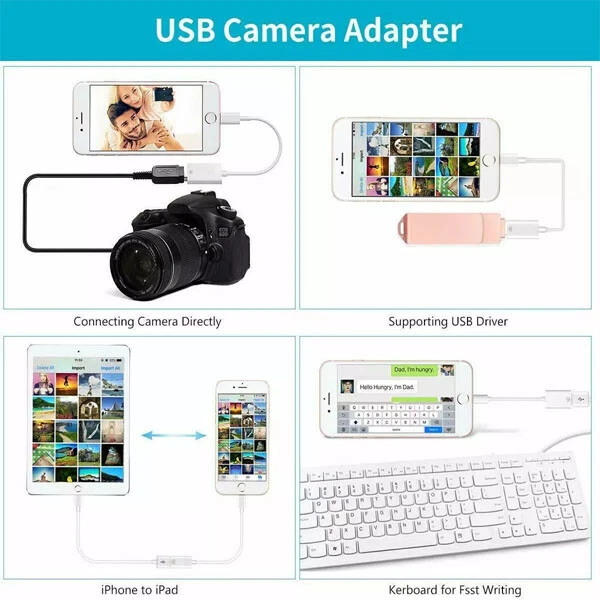 OTG USB to camera adapter for iphone supprot USB Flash Drive, MIDI Keyboard HOW TO USE: Connect the USB Camera Adapter to iPhone/iPad, open the Photos app, which let you choose photos and videos to import, then organizes them into albums. for iOS13+,You can transsfer picture,video,MP3 files,MP4 files,Excel,Word,PPT,PDF on Files App. PLUG AND PLAY: Easy to use, No need to take out the memory card from the camera, fast and stable connection. With the USB Camera Adapter, you can transfer photos & videos from your high-resolution digital camera to your Phone and Pad directly. You can also share the human scenery along the way with your family or friends anytime, anywhere, and share the unforgettable moments you encounter. Peripherals Supported: Digital camera, SLR Camera, USB Flash Drive, Card reader, USB Headphone, guitar, MIDI keyboard, etc.(The maximum current of the peripherals does not exceed 500 mAh). Do NOT support the printer, hard disk drive. Partial support with Ethernet, DAC. With USB 2.0 speed, 14MB/S - 16MB/S. Compatible Device: This adapter compatible with multiple devices, such as iPhone 11/Xs/Xs Max/X/8/8 Plus/7/7Plus/6/6 Plus/5/5S/SE and iPad Air /Mini /Pro (under folder:DCIM. The iPhone 7 and later models can read 4K video.) Support iOS 9.2- iOS16 and before - No APP Needed. Buyer Note: If you are satisfied with our service, we appreciate you leaving us a positive feedback and 5 star rating review! Your opinion is important to the success of our business. If you are not satisfied with the product or have not received the product for more than 35 days, please contact us to resolve, we will do our best to solve. We are sure to come up with a satisfactory solution. Please contact us first before leaving cold feedback or good feedback of 1-3 stars and opening the case. We'll do our best to solve your problem. Because we believe that everything can be solved through communication. Thank you very much!
