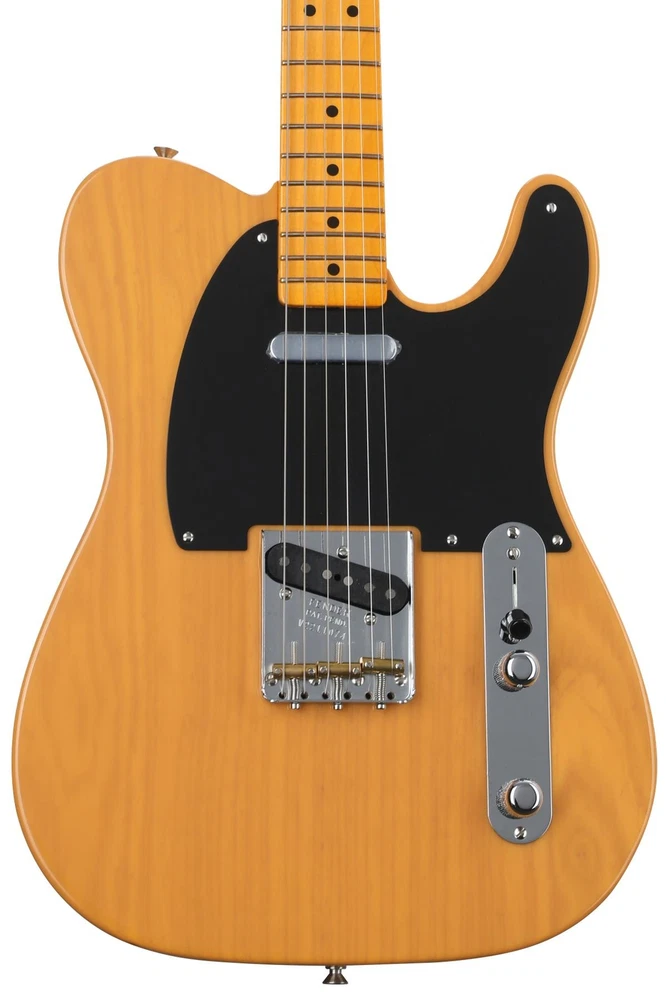 A Spot-on Re-creation of a First-gen Tele The Fender American Vintage II 1951 Telecaster is a spot-on re-creation of the '51 Tele, which was the first electric guitar to roll off Fender's assembly line bearing the "Telecaster" name. Built from a slab of solid ash, this axe delivers a bright, sustaining acoustic tone, which is complemented by a set of year-specific Pure Vintage '51 Telecaster single-coil pickups. You'll be blown away by the substantial playability of the '51 Telecaster's "U"-shaped hard-rock maple neck, while its vintage-radius fingerboard ensures inspiring, comfortable fretting. The American Vintage II 1951 Tele is chock-full of period-correct appointments, including knurled dome knobs, a 3-barrel bridge, vintage-style tuning machines, and an eye-grabbing nitrocellulose lacquer finish on the body and neck. The American Vintage II 1951 Telecaster represents an important piece of Fender history — it's a must-have for every Tele connoisseur.Loads of period-accurate appointments The American Vintage Sweetwater is an Authorized Fender Dealer Genuine Open Box Item Sweetwater's 2-year warranty and 55 point inspection Fender American Vintage II 1951 Telecaster Electric Guitar - Butterscotch Blonde Solidbody Electric Guitar with Ash Body, Maple Neck, Maple Fingerboard, and 2 Single-coil Pickups - Butterscotch Blonde A Spot-on Re-creation of a First-gen Tele The Fender American Vintage II 1951 Telecaster is a spot-on re-creation of the '51 Tele, which was the first electric guitar to roll off Fender's assembly line bearing the "Telecaster" name. Built from a slab of solid ash, this axe delivers a bright, sustaining acoustic tone, which is complemented by a set of year-specific Pure Vintage '51 Telecaster single-coil pickups. You'll be blown away by the substantial playability of the '51 Telecaster's "U"-shaped hard-rock maple neck, while its vintage-radius fingerboard ensures inspiring, comfortable fretting. The American Vintage II 1951 Tele is chock-full of period-correct appointments, including knurled dome knobs, a 3-barrel bridge, vintage-style tuning machines, and an eye-grabbing nitrocellulose lacquer finish on the body and neck. The American Vintage II 1951 Telecaster represents an important piece of Fender history — it's a must-have for every Tele connoisseur. Loads of period-accurate appointments The American Vintage II 1951 Telecaster is a spot-on re-creation of a Fender classic. This electric guitar features a solid ash body. This resonant wood offers a bright acoustic tone with excellent sustain and loads of midrange "pop," plus it boasts a gorgeous gloss nitrocellulose lacquer finish. The 1951 Tele's nickel/chrome hardware includes a 3-barrel bridge with brass saddles, vintage-style tuning machines, and knurled dome knobs. Year-specific '51 Pure Vintage pickups, a period-correct neck shape, and vintage-radius fingerboard round out the American Vintage II 1951 Telecaster's classic appointments. Year-specific Pure Vintage pickups When you plug the Fender American Vintage II 1951 Telecaster into your favorite amplifier, you'll be transported straight back to '51. This solidbody electric guitar's Pure Vintage '51 Telecaster single-coil pickups churn out the tight lows and balanced mids you'd expect from an old-school Tele. And its bridge pickup twangs like it's nobody's business. The American Vintage II 1951 Tele comes complete with master volume and tone knobs, plus a 3-way pickup selector switch. Substantially playable neck When we first picked up the American Vintage II 1951 Telecaster here at Sweetwater, we were blown away by its epically substantial playability. The '51 Tele's 1-piece, "U"-shaped, hard-rock maple neck offers baseball-bat-like dimensions — thick, beefy, and resonant — for a hand-filling playing experience. You also get a maple fingerboard with a vintage 7.25-inch radius and 21 vintage-tall frets. The neck features a vintage tint, and it's finished with eye-catching gloss nitrocellulose lacquer. Fender American Vintage II 1951 Telecaster Electric Guitar Features: A spot-on re-creation of a 1951 Telecaster Solid ash body offers a bright acoustic tone with excellent sustain and loads of midrange "pop" Pure Vintage '51 Telecaster single-coil pickups provide jangly, smooth, sparkling tones with a distinct twangy bite Knurled dome master volume and tone knobs; 3-way pickup selector switch 1-piece, "U"-shaped hard-rock maple neck offers a hand-filling playing experience Maple fingerboard with a vintage, 7.25-inch radius and 21 vintage-tall frets 3-barrel bridge with brass saddles; vintage-style tuning machines Eye-catching nitrocellulose lacquer finish on the body and neck Specification Detail Number of Strings 6 Left-/Right-handed Right-handed Body Type Solidbody Body Shape Telecaster Body Material Ash Color Butterscotch Blonde Body Finish Gloss Nitrocellulose Lacquer Neck Material 1-piece Maple Neck Shape 1951 U Neck Joint Bolt-on Radius 7.25" Fingerboard Material Maple Fingerboard Inlay Black Dots Number of Frets 21, Vintage Tall Scale Length 25.5" Nut Width 1.650" Nut Material Bone Bridge/Tailpiece Pure Vintage 3-saddle Tele with Brass Barrel Saddles Tuners Fender Deluxe Pure Vintage Neck Pickup Pure Vintage '51 Single-coil Tele Bridge Pickup Pure Vintage '51 Single-coil Tele Controls 1 x master volume, 1 x master tone Switching 3-way blade pickup switch Strings .010-.046 Case/Gig Bag Hardshell Case RETURN INFORMATION We want you to be completely happy with your purchase from Sweetwater. If you are not satisfied with your product, you may return it for a refund of the purchase price within 30 days. If your purchase was eligible for Free Shipping, the shipping cost will be deducted from your credit or refund. Returns must be in the complete and original packaging with all accessories and complete documentation (Owner's Manual, warranty card, quick start guides, etc.), show no signs of wear or use, and include a Return Authorization number or be su