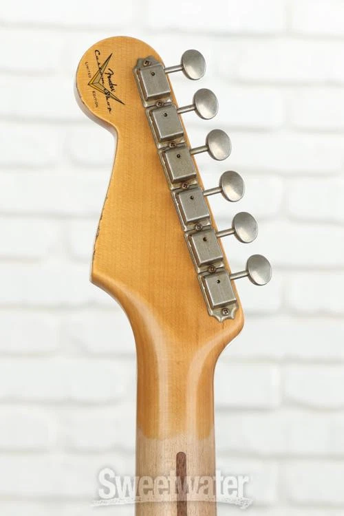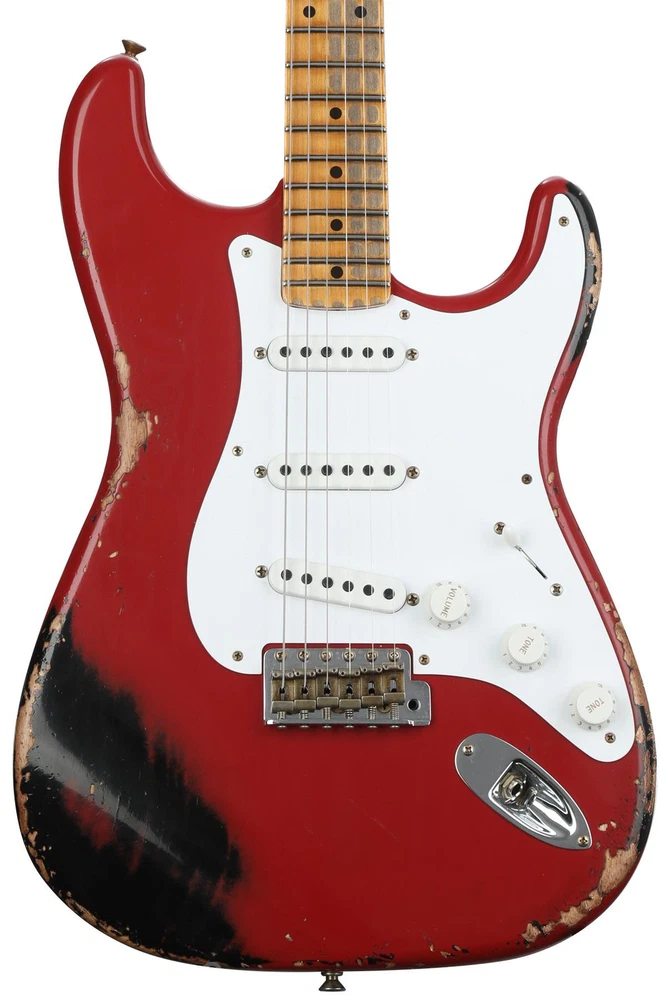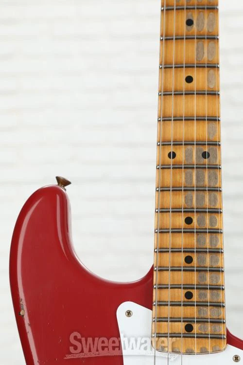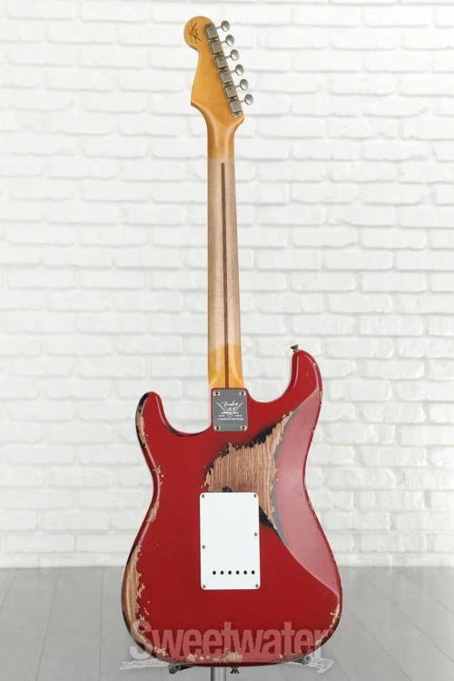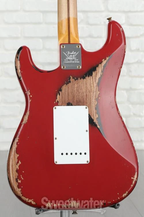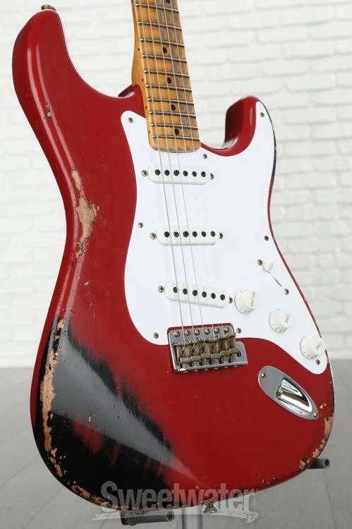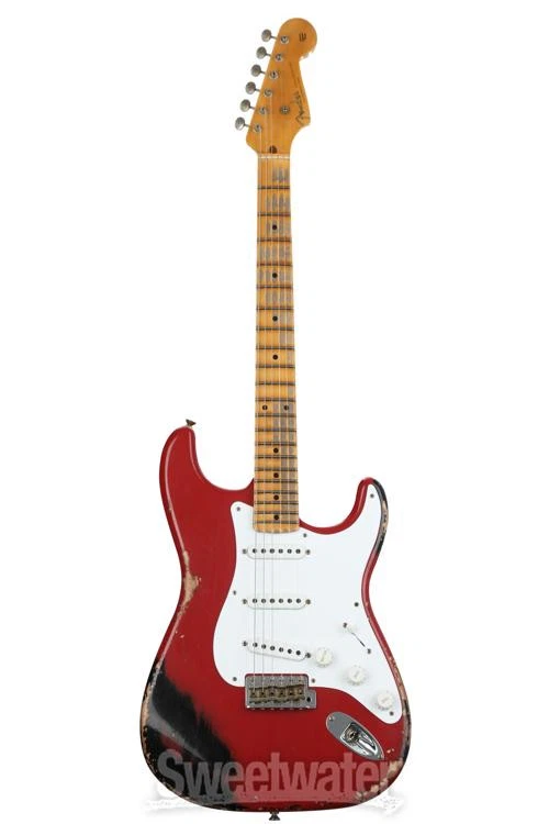Celebrate the 6-string That Started it All Celebrating the Stratocaster’s 70 years of solidbody dominance, the LTD 70th-anniversary ’54 Stratocaster Heavy Relic is a time machine of a 6-string that transports you straight back to Fullerton, California, circa 1954. From the 2-piece select ash body’s offset center seam to the chunky feel of the 5/4 quarter-sawn maple neck’s period-correct profile, the Fender Custom Shop has spared no expense in recreating the magic and mystique of Leo Fender’s very first Stratocasters. Three custom-designed hand-wound ’54 Stratocaster pickups replicate the snappy, bell-like tone that originally put the Strat on the map, with an updated 5-way switch for easy access to the two and four position’s signature “quack.” It’s all finished off with two modern performance-minded specs that even Sweetwater’s most rabid vintage fanatics can’t help but appreciate: a 7.25–9.5-inch compound radius and medium-vintage frets for slick playability from the first fret all Sweetwater is an Authorized Fender Custom Shop Dealer Genuine New Item Sweetwater's 2-year warranty and 55 point inspection Fender Custom Shop LTD 70th-anniversary '54 Stratocaster Heavy Relic Electric Solidbody Electric Guitar with Ash Body, Maple Neck, Maple Fingerboard, Vintage Tremolo, and 3 Single-coil Pickups - Red Over Black Celebrate the 6-string That Started it All Celebrating the Stratocaster’s 70 years of solidbody dominance, the LTD 70th-anniversary ’54 Stratocaster Heavy Relic is a time machine of a 6-string that transports you straight back to Fullerton, California, circa 1954. From the 2-piece select ash body’s offset center seam to the chunky feel of the 5/4 quarter-sawn maple neck’s period-correct profile, the Fender Custom Shop has spared no expense in recreating the magic and mystique of Leo Fender’s very first Stratocasters. Three custom-designed hand-wound ’54 Stratocaster pickups replicate the snappy, bell-like tone that originally put the Strat on the map, with an updated 5-way switch for easy access to the two and four position’s signature “quack.” It’s all finished off with two modern performance-minded specs that even Sweetwater’s most rabid vintage fanatics can’t help but appreciate: a 7.25–9.5-inch compound radius and medium-vintage frets for slick playability from the first fret all the way to the 21st. Last but certainly not least, each LTD 70th-anniversary ’54 Stratocaster sports a striking nitrocellulose lacquer finish with attention-grabbing colors handpicked by Sweetwater’s guitar experts. Here’s to 70 more years of Stratocaster supremacy! Precision-voiced pickups capture the sound of '54 Few Fender fans can knock the Telecaster's two powerhouse pickups, but Leo Fender was of a much different mind back in 1954. The electric guitar was still in its early days, and just a few years before, one pickup was the norm for electric guitars, let alone two pickups. Well, why not bring that count up to three? Like many of Leo Fender's 1950s creations, he hit the Stratocaster's trio of single-coil pickups right out of the park on his very first try. The Fender Custom Shop LTD 70th-anniversary '54 Stratocaster’s custom trio of Custom Shop hand-wound ’54 pickups expertly replicate the sound of the world's very first Stratocasters — a sound that many players argue has ruled as the definitive electric guitar sound for 70 years. These pickups capture the same crystalline highs, rotund lows, and snappy bite that first solidified the Stratocaster as perhaps Leo's crowning achievement, crafted by the Fender Custom Shop for exacting component-level authenticity. Lastly, the LTD 70th-anniversary ’54 Stratocaster takes a minor modern detour, brandishing a 5-way switch, allowing you to easily access the Strat's iconic quack without lodging the pickup selector switch in between positions. Modernized compound-radius fingerboard From headstock to strap pin, the Fender Custom Shop LTD 70th-anniversary ’54 Stratocaster is a spot-on replication of the Strat as Leo envisioned it back in 1954. Well, with a few tiny exceptions, namely the frets and the fingerboard radius. Instead of the rounded 7.25-inch-radius fingerboard found on most vintage Strats, the LTD 70th-anniversary ’54 Stratocaster comes equipped with a 7.25–9.5-inch compound radius — a supremely playable setup that both preserves the comfortable low-position chording afforded by the classic 7.25-inch radius, while also smoothing out for easier bends as you climb up the frets. Similarly, this guitar’s medium-vintage frets clock in just slightly larger than diminutive vintage frets, enhancing performance without negating the fast feel provided by smaller frets. Period-correct neck profile As a general rule, neck shapes have thinned out since the early days of the electric guitar; neck profiles that most guitarists would regard as “chunky” today were positively speedy by the standards of the mid-20th century! So it is with the LTD 70th-anniversary ’54 Stratocaster’s profile. A rather stout shaft of ultra-stable 5/4 quarter-sawn maple mirrors the shape found on Leo’s first Strats. Substantial but not unwieldy, this Strat’s neck profile is sure to please players who favor a vintage feel, while remaining fast enough to not scare off modern adherents to the slim “C” neck. Fender Custom Shop LTD 70th-anniversary '54 Stratocaster Heavy Relic Features: Celebrating the Strat’s 70th birthday, with custom nitrocellulose lacquer finishes handpicked by Sweetwater’s guitar experts 2-piece select ash body with a period-correct offset center seam Ultra-stable 1-piece 5/4 quarter-sawn maple neck in a rather chunky-feeling ’54 Stratocaster profile Modern compound 7.25–9.5-inch radius and medium vintage frets offer the easy low-position chording made famous by early Strats, with a flatter, higher-performance feel as you climb the neck Classic Custom Shop Vintage sync