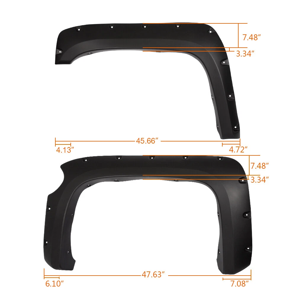 AUTOMOTO PRODUCT Fender Flares Fit For 07-13 Chevy Silverado 1500 Pocket Rivet Bolt On Style 69" Product Introduction Product Introduction Title: Fender Flares Application: For 2007-2013 Chevy Silverado 1500 LT / LTZ / WT / LS / Hybrid / XFE With 69.3" Bed Fleetside Models. (2007 Silverado Fit New Body Style Only) Color: Black Description: 100% brand new in original packaging. Product will be received exactly the same as shown in the picture! Made of high quality polypropylene with paintable smooth finish Full protection from mud scratches, sand and other outer damages for your wheels. Helps to reduce spray and protects paint with fender flares. Comes with bolts, nuts and all necessary mounting hardware for installation. Easy to install, no further modification to the body needed. Package Includes: A set (4pcs) of pocket style Fender Flares Necessary mounting hardware, as shown in the picture Note: All of the items in our shop will come to you with the tracking number. Visit shop home WELCOME to our ebay shop CONTACT US We Open 7 Days A Week ABOUT US ABOUT US: Welcome to GPLUS's eBay Store. We specialize in aftermarket automotive car parts and is the #1 industry distributor for affordable and quality products. Welcome to GPLUS's eBay Store. We specialize in aftermarket automotive car parts and is the #1 industry distributor for affordable and quality products. Welcome to GPLUS's eBay Store. We specialize in aftermarket automotive car parts and is the #1 industry distributor for affordable and quality products. SHIPPING Shipping Information All items will ship within 24 hours (Monday - Friday). Payment cleared/received on Friday will be shipped on the next business days (Monday or Tuesday). We are not responsible for carrier transit time. This information is provided by the carrier and excludes weekends and holidays. Note that transit times may vary, particularly during peak periods or in climate weather conditions, and that delivery times frames will need to be extended for any processing time frames in excess of 1-2 business days. excess of 1-2 business days. International Shipping: International buyers are responsible for possible customs fees, brokerage fees or duty fees. We would appreciate for understanding of tracking number would not be updated in between the city of departing in the U.S. and the city of destination. ATTENTION Cargo transportation Double check shipping address. We are not responsible for incorrect or undeliverable addresses. Please use Shipping & Payments tab on top of page for shipping details for your location. Transaction will be held until a full shipping amount received. Shipping address Some of the packages cannot be delivered to a PO Box. Customer is responsible to ensure PO Box address given is deliverable by the shipping company. Package will be held until a valid physical address is provided. Customer assumes shipping charges incurred in shipping to undeliverable address. Customs duties International buyers are responsible for all customs duties, taxes, and other applicable fees incurred by the country's customs/border regulations. Please contact customs for more information. We are not responsible for any changes to address after item has been shipped. RETURN please notify us within 30 days after you've received your purchased item. Return Policy: Buyers pay for return shipping fee. Items to be returned must be in resalable condition.14 Days money back, please notify us within 14 days after you've received your purchased item. If your order has been received and it is not what you ordered, or if your item has a manufacturer defect, please contact us within 14 days from delivery date. And you must contact us to request an Return Merchandise Authorization Number (RMA). No return package will be accepted without a valid RMA number. All products are covered by our warranty against defects. EMAIL click here for questions All return requests must be submitted through your eBay account. Iterms and Condition For emissions related items, please check with your local jurisdiction for emission specific requirements before purchasing. All items do not come with installation instruction unless otherwise specified. If item is questionable, please consult your local professional/mechanic before making purchase.