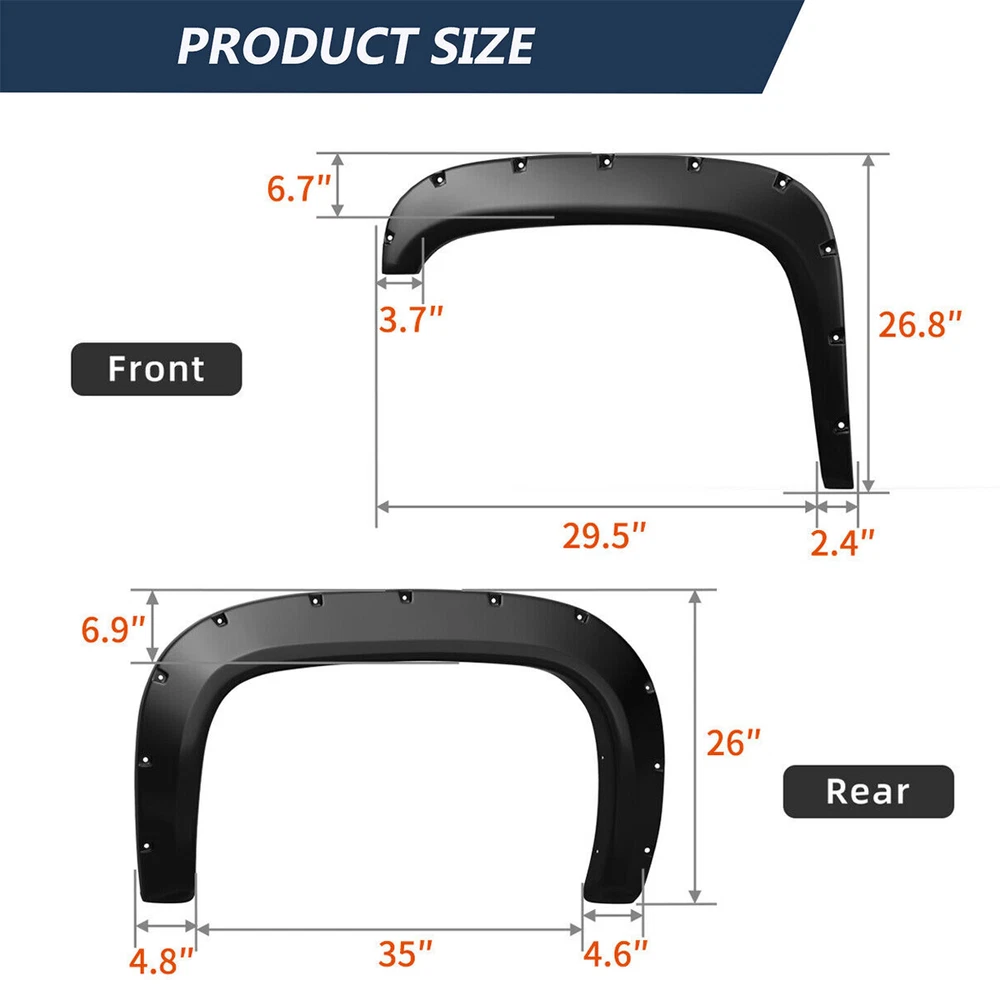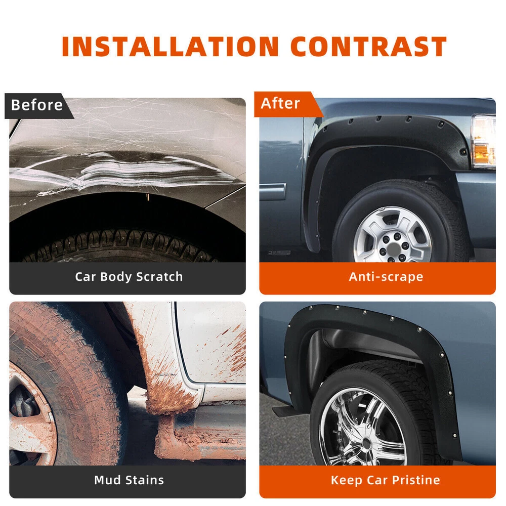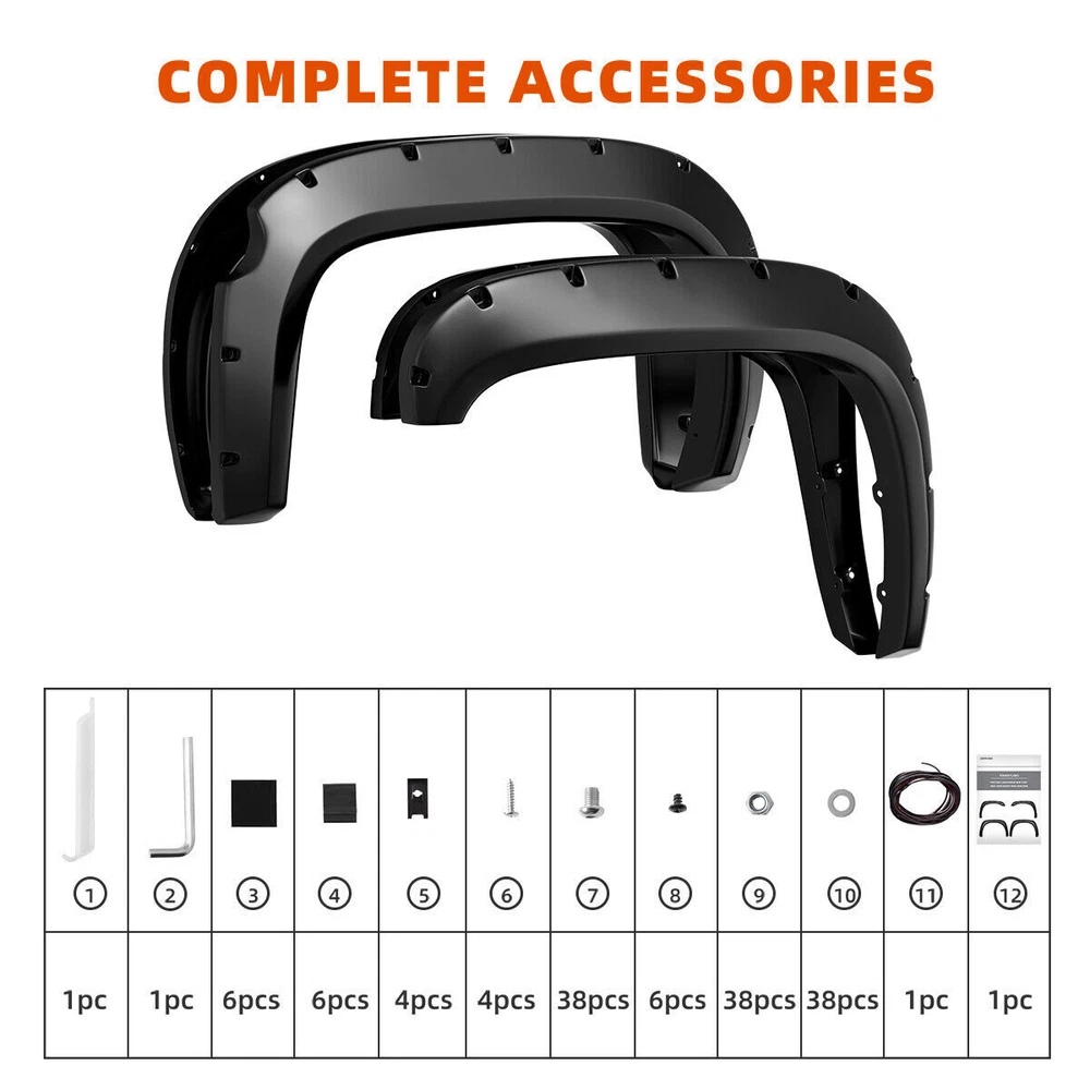 Lamp Assembly Control Arms Floor Mats Catalytic Converters Cooling Systems Coils & Modules Mirrors Wheel Lugs Exhaust Shocks & Struts Other PRODUCT DESCRIPTION Compatible With: for 2007- 2013 Chevy / Chevrolet Silverado 1500 (Only Fit 69.3" (5.8FT) Bed Fleetside Models) & (2007 Silverado Fit New Body Style Only) Features: PREMIUM PP MATERIAL Each set of Fender Flares is made of premium material to ensure that the fenders are brighter and more durable. EASY TO INSTALL Accurate trimming to fit the wheels perfectly. Installation manual and necessary mounting hardware kit are included in the package. UV PROTECTION Add UV powder during the production process to ensure that the fender flares are free of chalking and cracking. Matte black finish design, it could be painted according to the specific color of your vehicle. OFF ROAD LOOK Protect the wheel well from mud, scratches and other external damage. Package Included : 4pcs Fender Flares (front & rear) Mounting hardware Installation instruction SHIPPING The shipping rates listed are only for residential or commercial destinations in the continental 48 United States. All international sales will go through eBay Global Shipping Program.Please ask us if there are any questions. We only ship the item to the address that is sent to us at the time of checkout. Please verify the correct shipping address in your PayPal account before making your payment. If we ship your item to an old or invalid address and you are not able to locate the item, we are not responsible for shipping a replacement. Currently, we do not ship to Hawaii, Alaska, Puerto Rico,APO/FPO/PO Boxes. We use USPS, UPS & FedEx as shipping method. Payments cleared before 12 PM PST, will be shipped on the same day. PAYMENT We accept PayPal and all forms of credit card. We will only ship to the confirmed Paypal shipping address given with the payment. We do not offer local pick up service. RETURN 30 days Money Back Guarantee. If any package that needs to be returned, please contact our customer service first to receive a RMA form. All return items MUST be in brand new condition. ABOUT US Specialized in aftermarket auto parts since 2012, we source and work directly with professional manufacturers to provide the highest quality parts at the most economical prices. We also have over 5 years of shipping experience with FedEx and USPS.Our Packing Quality is Guaranteed,Item shipping is Timely! On Jul 5, 2023 at 00:42:22 PDT, seller added the following information: On Jun 13, 2024 at 12:24:34 PDT, seller added the following information: On Sep 19, 2024 at 05:15:27 PDT, seller added the following information: On Sep 29, 2024 at 22:41:26 PDT, seller added the following information: On Sep 29, 2024 at 23:33:39 PDT, seller added the following information: