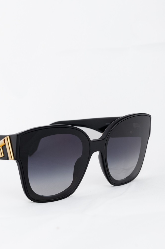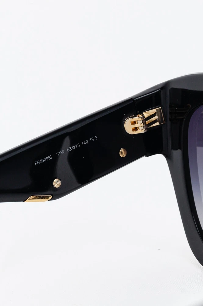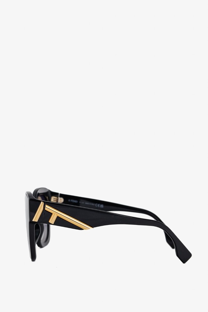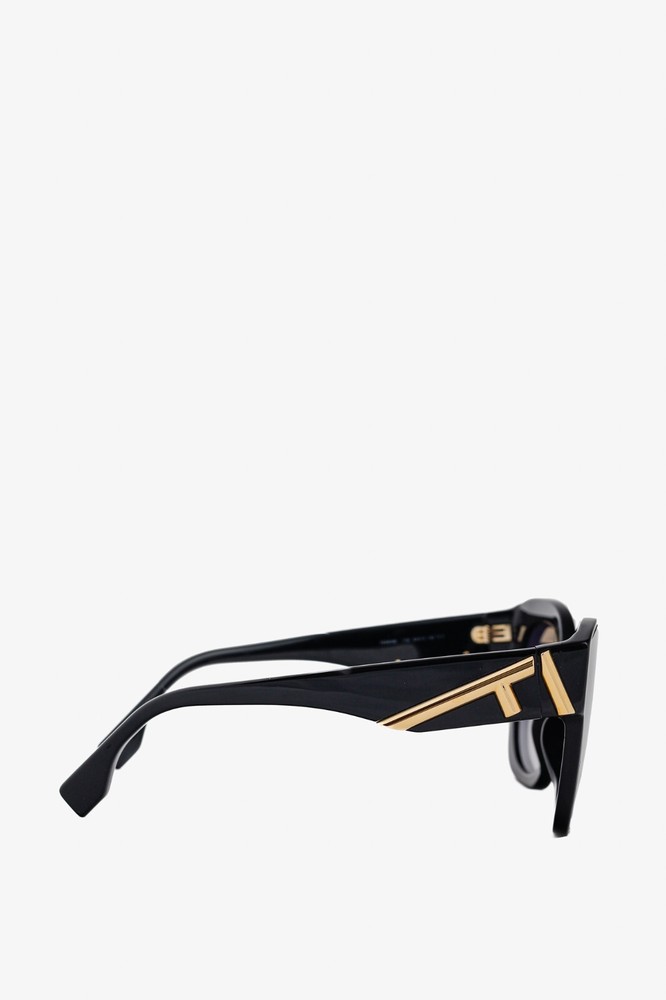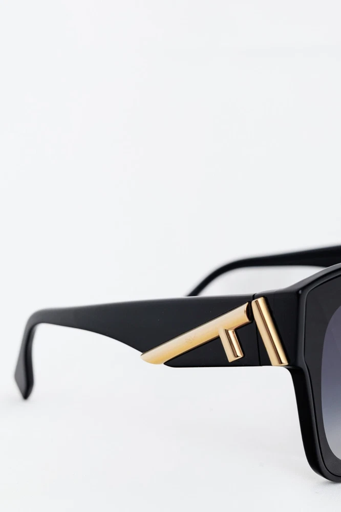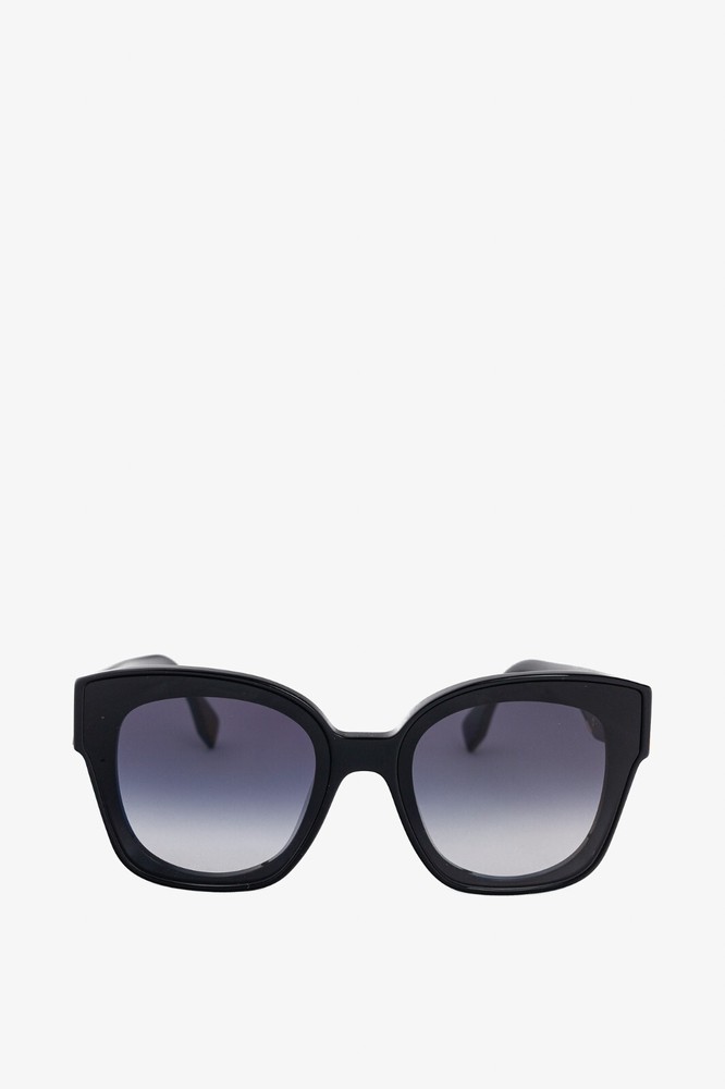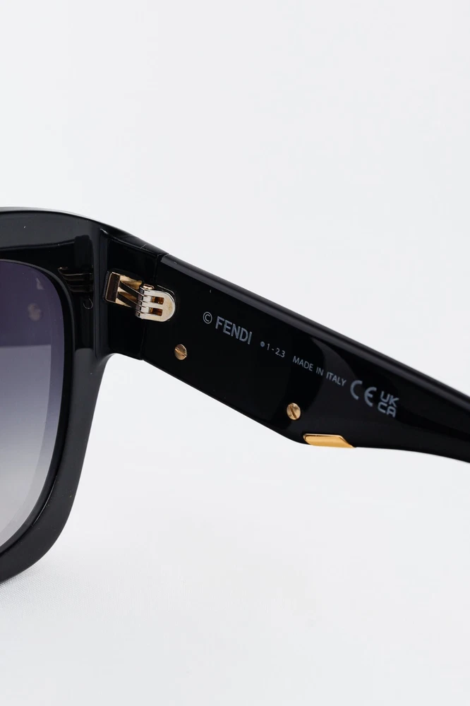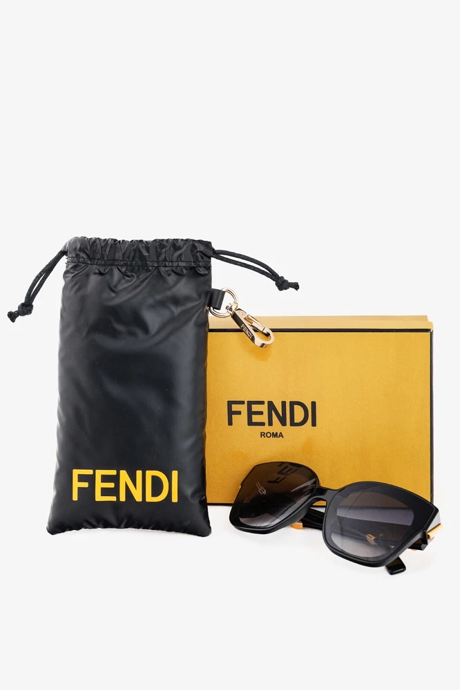 Made in Italy, these sunglasses from Fendi are made in a black acetate, and feature oversized square frames, blue-gradient tinted lenses, inset nosepads, and gold-tone F-motif hardware on the temples. Condition: Excellent; very light rubbing throughout. Comes with authenticity card, info booklet, cleaning cloth, case, and box. Approximate Measurements: Height: 2.25” (6 cm) Width: 5.75” (14.5 cm) Arm Length: 5.25” (13 cm) Composition: Acetate, metal.