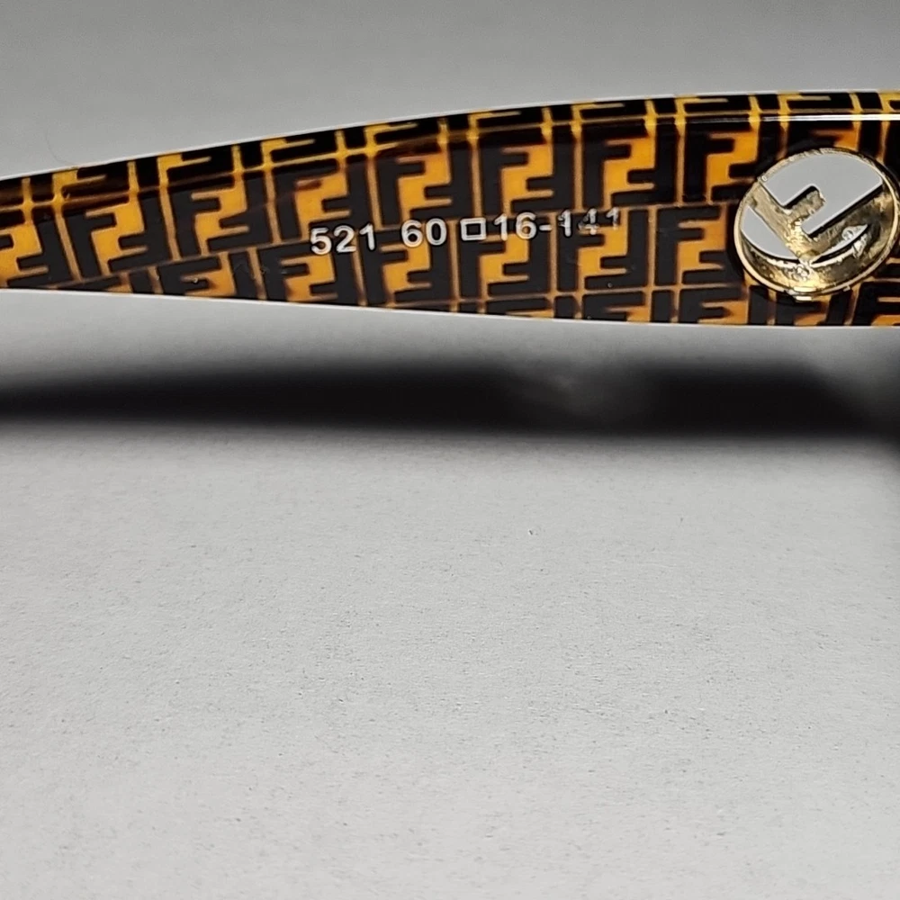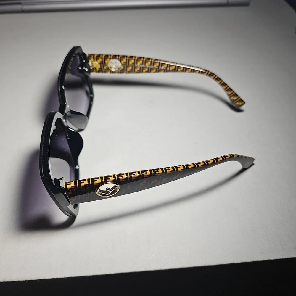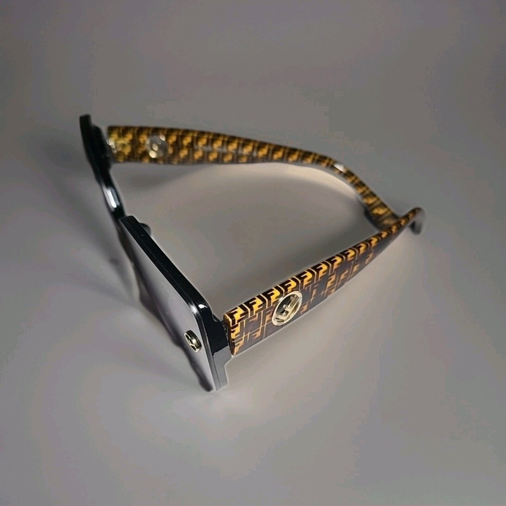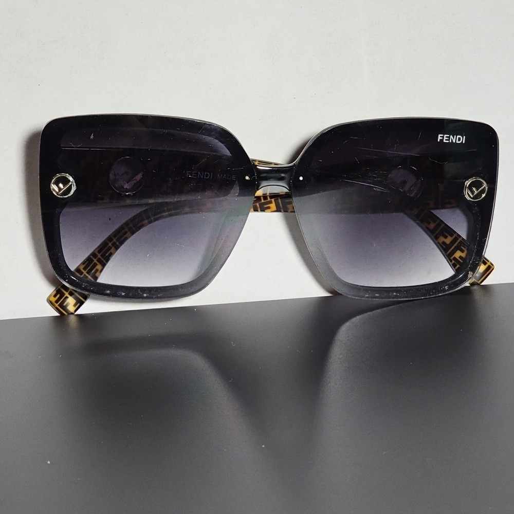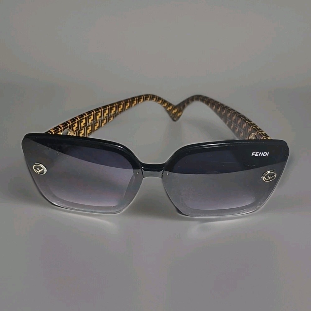 SELLING AS FRAMES ONLY LENSES ARE SCRATCHED NO RETURNS 60*16*141 The product is a pair of Fendi FF519 oversized square sunglasses frames in black with brown logo detailing. Designed for women, these sunglasses feature both plastic and metal frame materials with a stylish square shape and a purple lens color. Made in Italy, the frames have a temple length of 141mm, providing a luxurious and fashionable accessory for sunny days.