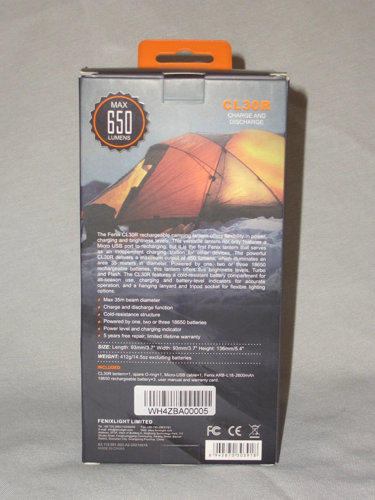 Fenix Flashlights CL30R 650 lumens Camping Lantern, Black Brand New Sealed In The Box Rechargeable Lantern Flexibility in power charging & brightness levels. Features a Micro USB Port for recharging. Serves as an independent charging station for other devices! Turbo & Flash Features a cold resistant battery compartment for all-season use.