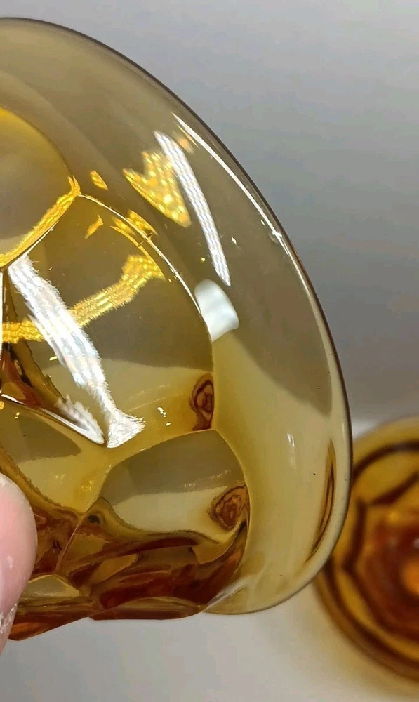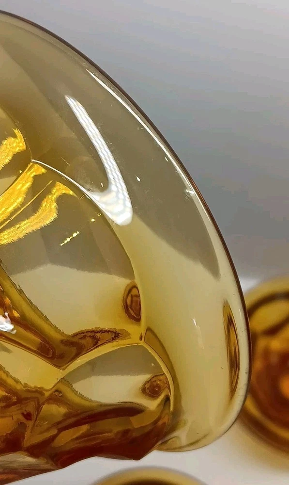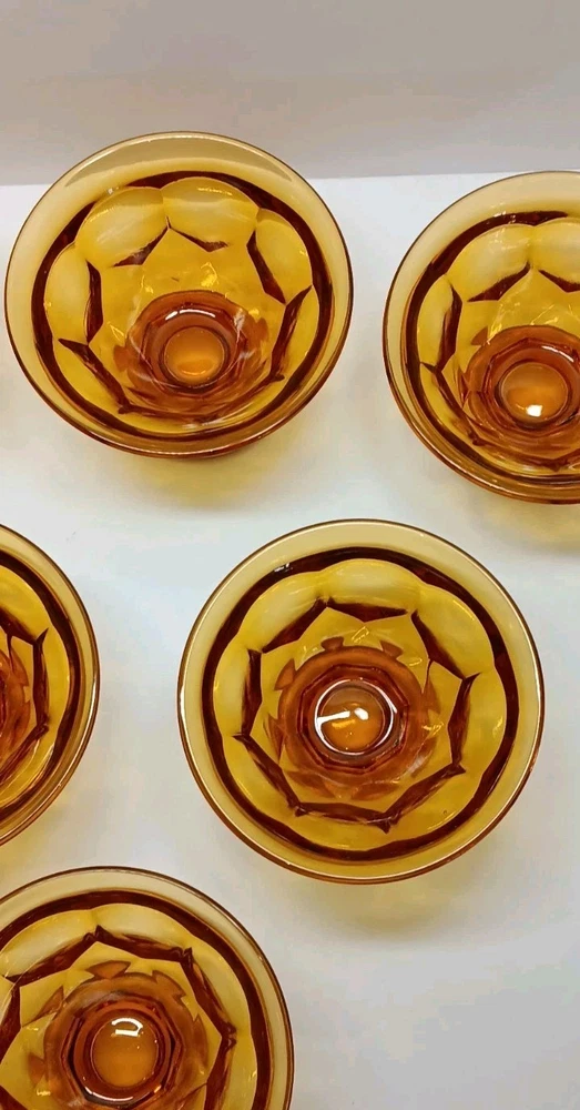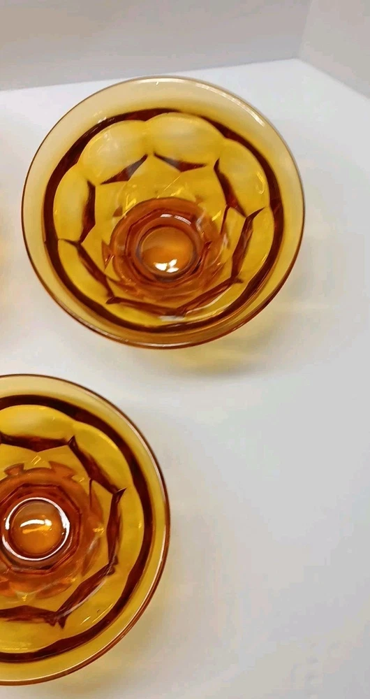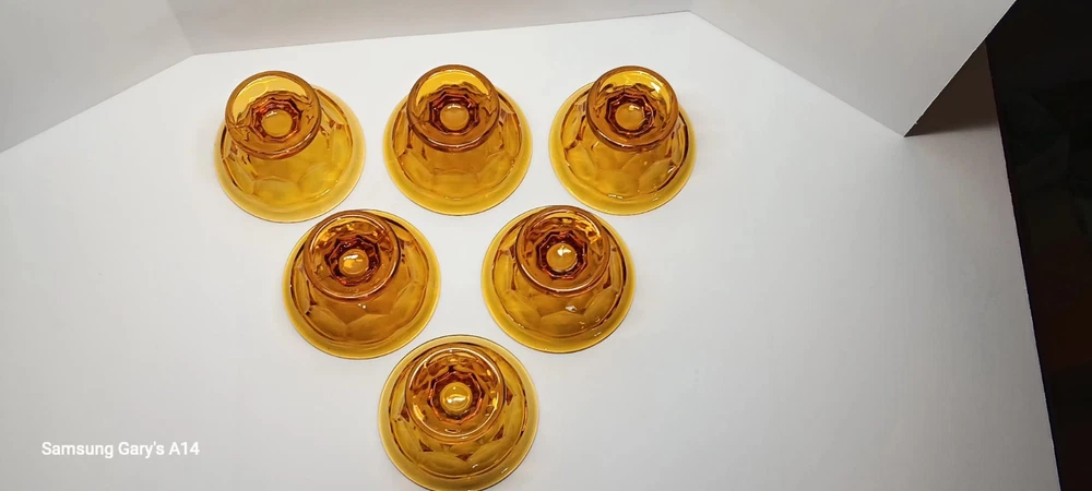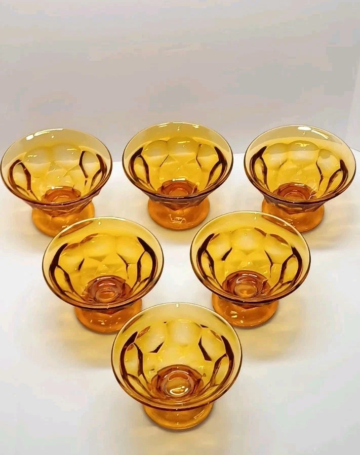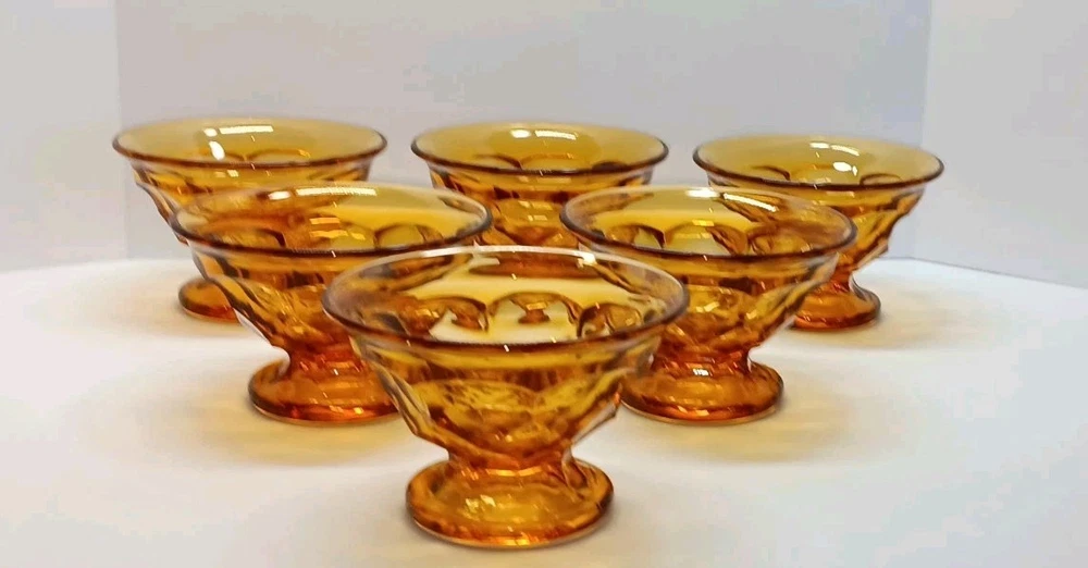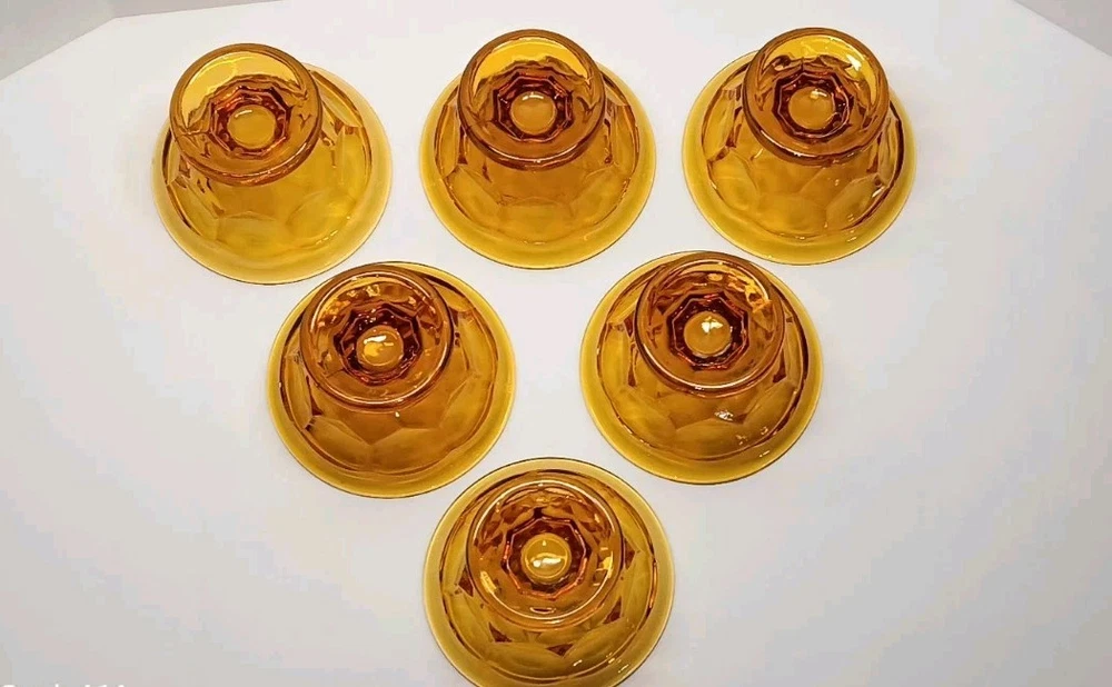 This set of six Georgian amber champagne/tall sherbet glasses by Fenton is a true vintage piece from 1931. The glasses are made of pressed glass and have a honeycomb design with a flared rim and decorative features. Each glass has a 4 oz. capacity and stands 2 5/8" tall. These glasses are handcrafted and have a glossy finish. They are perfect for all occasions and will add a touch of elegance to your drinkware collection. The glasses are unmarked and have no sticker backstamp. They weigh 2 lbs. 14 ozs. and should be hand washed only. In the photos towards the end of them there is one of the glasses that either has a small ding or a air bubble so I am not charging for that glass it's a set. You can't feel the mark it's really hard for me to tell if it's a air bubble or not. The other five don't have any chips or cracks or breaks of any kind. Really old set of Fenton. Amber is not everyone's favorite color but if you are a Fenton lover or collector they're nice and still desirable. If you have questions or concerns please feel free to contact me thank you for your interest in my store.