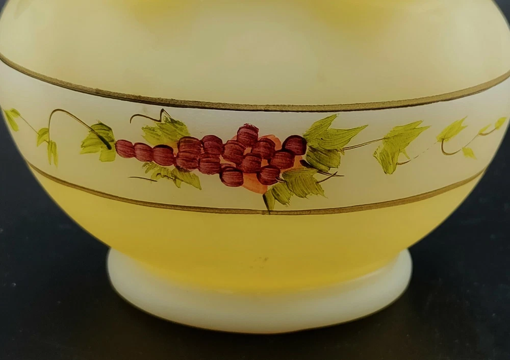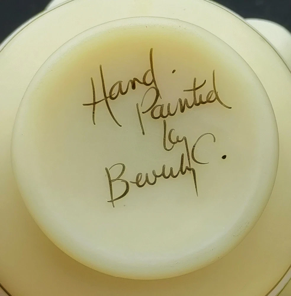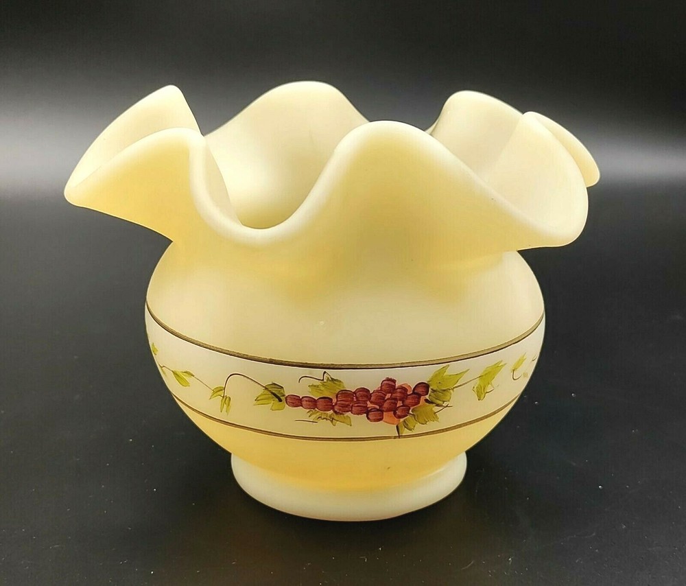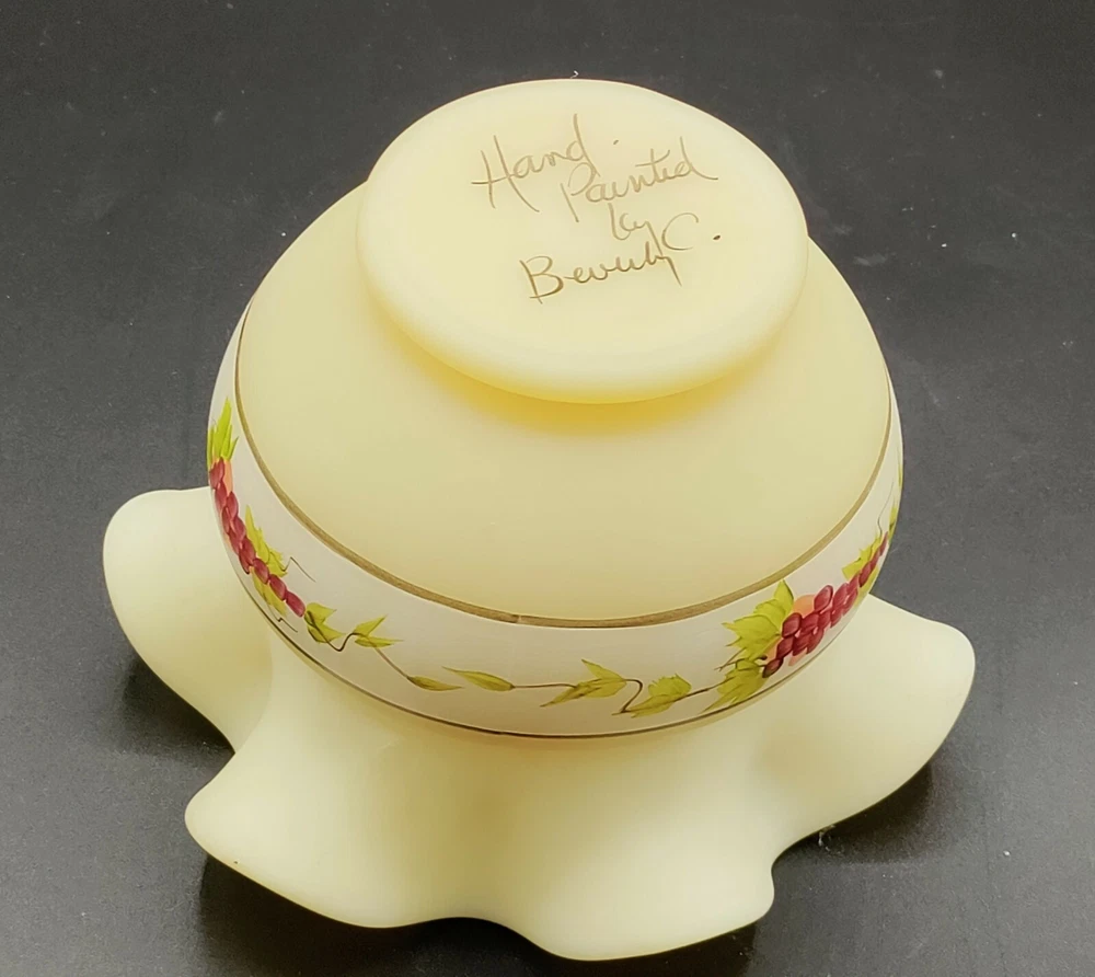 Fenton Art Glass Custard Satin Glass Vase Ruffled Grapes Signed Beverly C. measures 5-1/4" across x 3-3/4" tall Excellent condition, no damage Thanks for viewing!