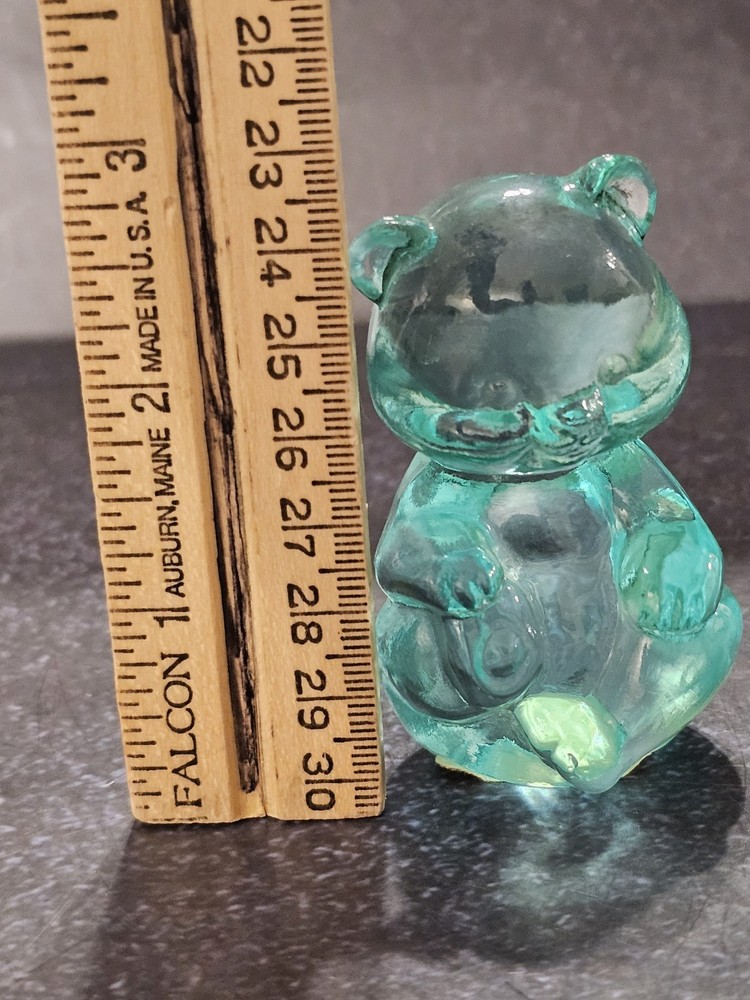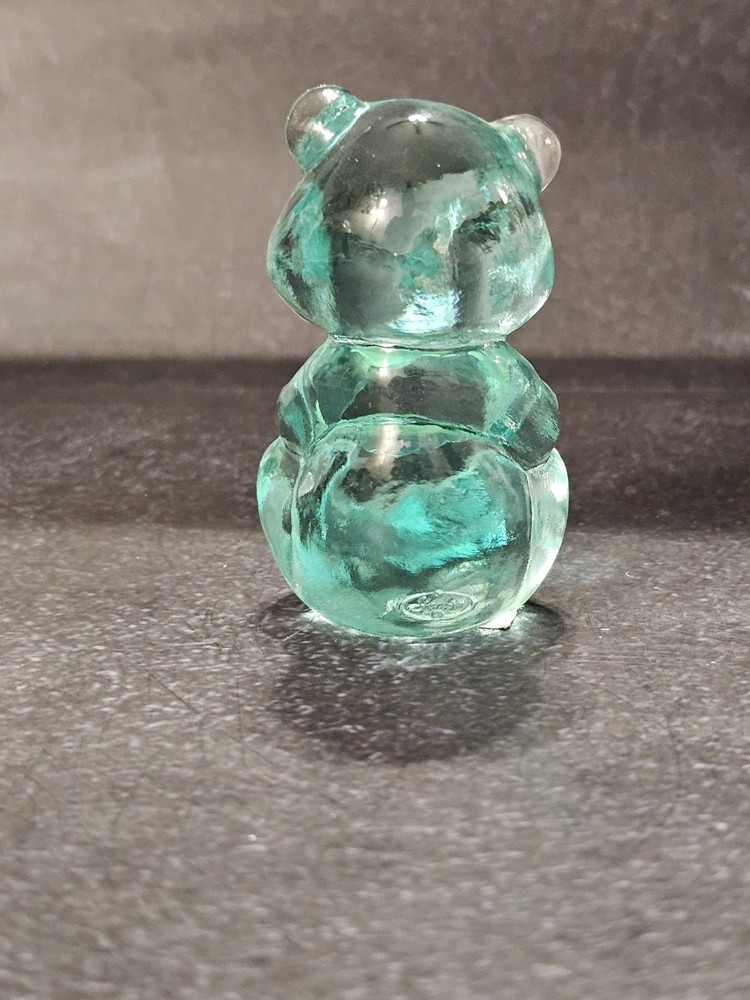 Crafted with care, this Fenton Art Glass figurine brings to life a charming bear motif. Standing at a quaint 2.75 inches tall and measuring 1.75 inches in width, this green-hued paperweight is a testament to the timeless elegance of North American artistry. Its glass material captures the light, giving the piece a subtle glow that enhances its handcrafted charm. The figurine, while unbranded, showcases the distinctive style of Fenton, a renowned name in glassware. An original production from the United States, it embodies the grace and detail that collectors and enthusiasts of art glass appreciate. It's a delightful addition to any collection, sure to be treasured for its aesthetic appeal and craftsmanship.