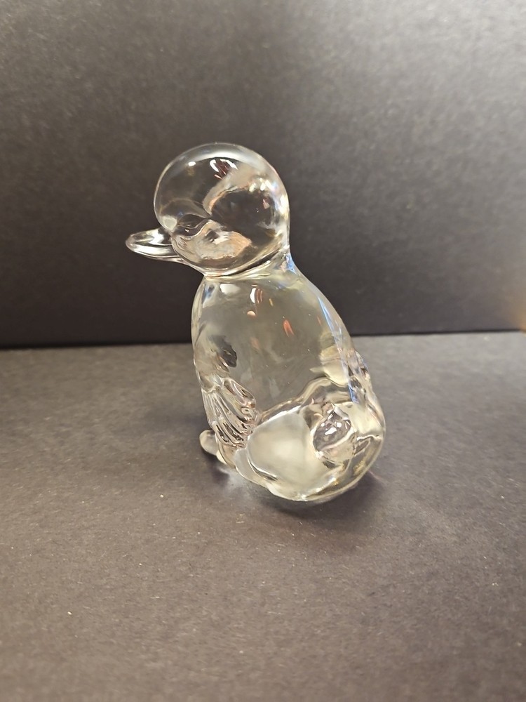This Fenton Duckling figurine is a 3.5-inch tall piece of clear solid glass, featuring a glossy finish. Made in the United States during the late 20th century, this vintage collectible is part of the Glass Pets product line. The figurine depicts a duckling in an animal-themed design, making it a decorative and charming addition to any collection. With its original production technique of molded glass, this Fenton duckling figurine is a unique and detailed piece for collectors of decorative pottery and glassware.