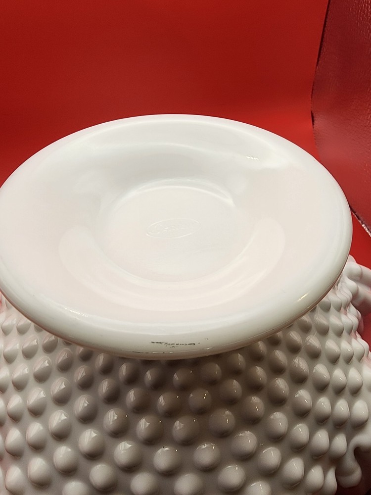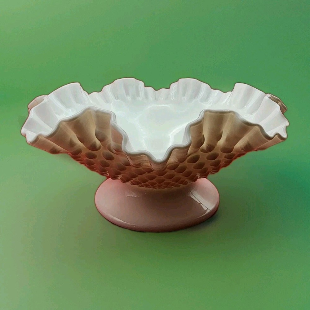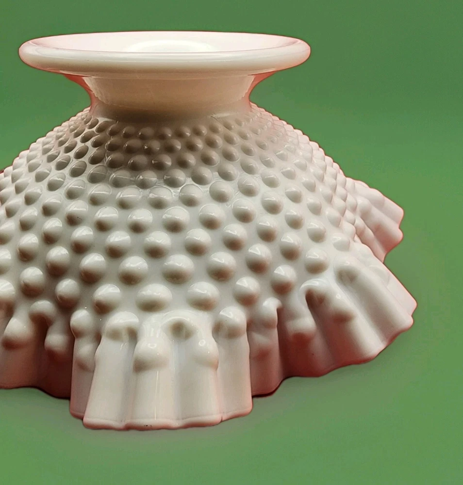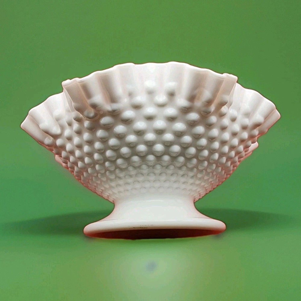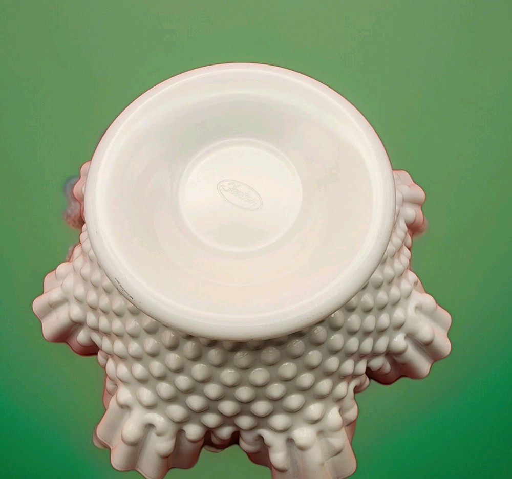 Elevate your home decor with the timeless elegance of the Fenton Hobnail Milk Glass Footed Bowl. Featuring a stunning crimped and ruffled rim, this piece exudes classic charm and sophistication. The bright, white milk glass provides a pristine backdrop for the distinctive hobnail pattern, making it a captivating addition to any collection or tabletop. Measuring 5 inches in height and 10 inches in width, the bowl is perfectly sized for a variety of uses, from serving desserts to displaying floral arrangements. Crafted with precision and care, this glass bowl is a testament to Fenton's legacy of quality and beauty, proudly made in the USA.