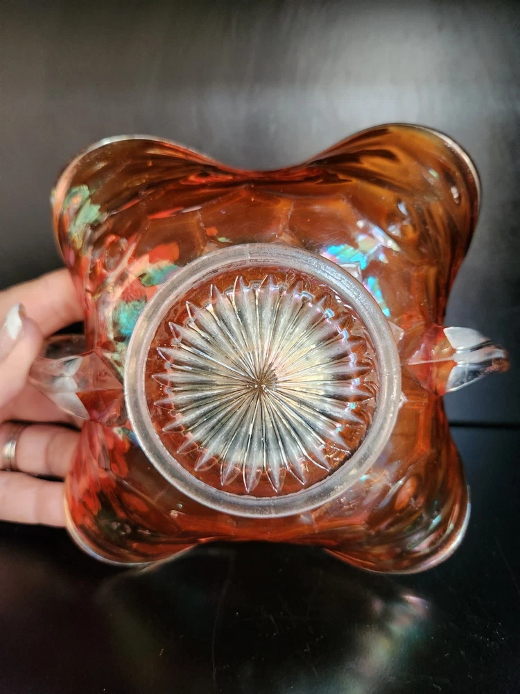 The Fenton 'Honeycomb & Clover' Marigold Carnival Glass Bonbon Dish with 2 Handles is a beautiful and elegant bowl made of glass. It features a square shape with a honeycomb pattern in a vibrant gold color, perfect for all occasions. This original piece from 1965 includes handles for easy carrying, making it a unique and collectible addition to your dinnerware collection. With its glossy finish and compact size of 2.5 inches in height and 7 inches in width, this bonbon dish is a stunning and decorative piece for your kitchen or dining table.