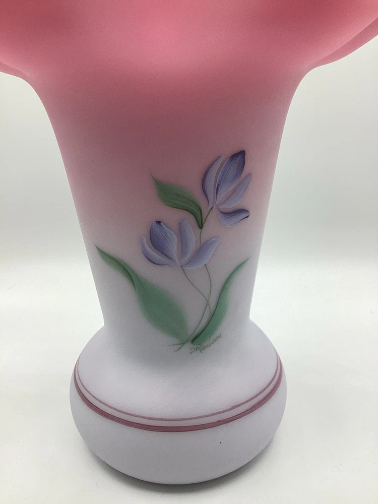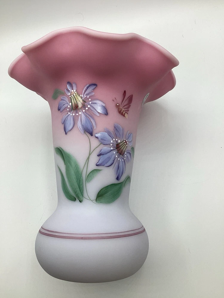 Fenton Ltd Ed Blue Burmese Honor Collection Showcase Dealer Exclusive 2001 Vase. This beautiful vase is designed by JK Spindler. Spindler’s bed of “Purple Passion Flowers” features a wistful hummingbird moth hovering nearby. Has beautiful purple flowers painted around the entire vase. It is hand painted and signed by the artist D. Robinson. The artist signature is signed underneath one of the flowers. Each piece is numbered and inscribed with the signature of Frank M Fenton. This piece is number 317 of only 2500. This vase is blue Burmese and is a showcase dealer exclusive piece. It is approximately 9 1/4” tall and the top opening is 8” across. There are no chips or cracks. Comes with the original box and card.