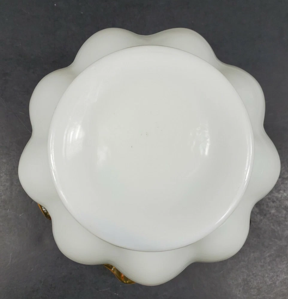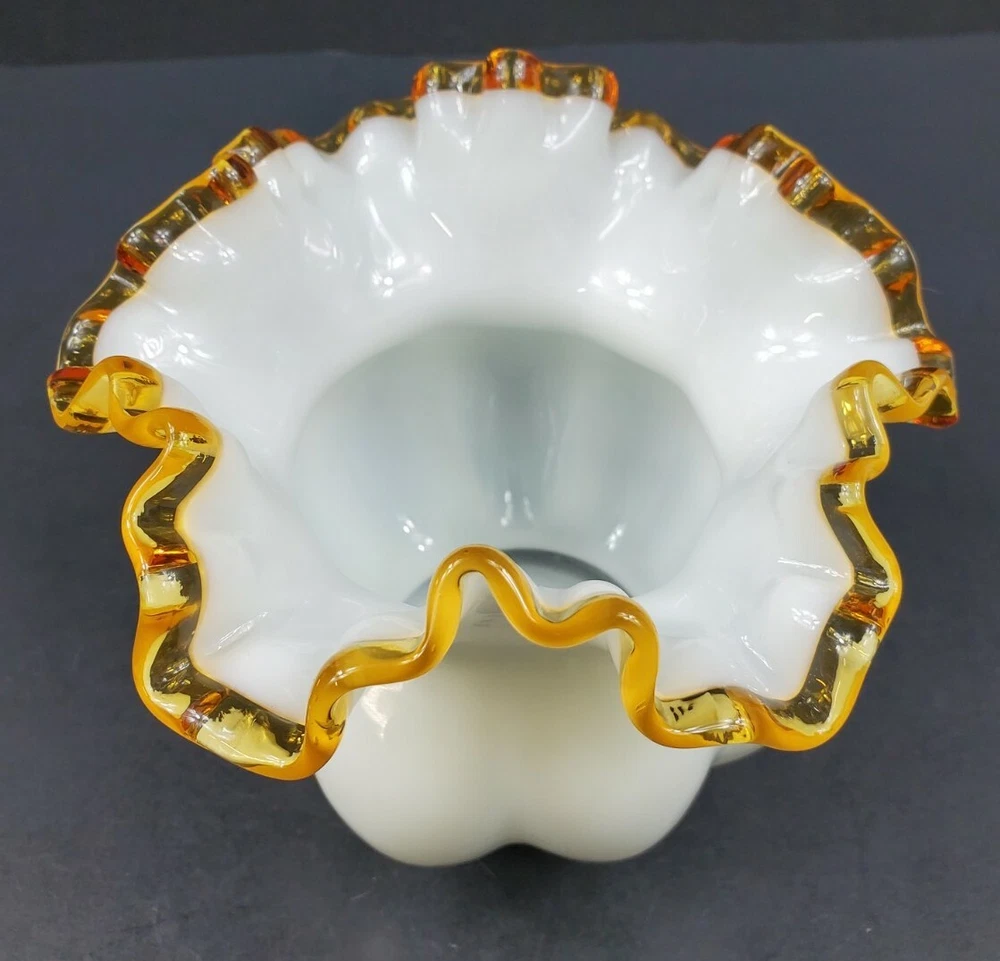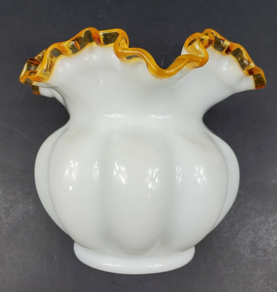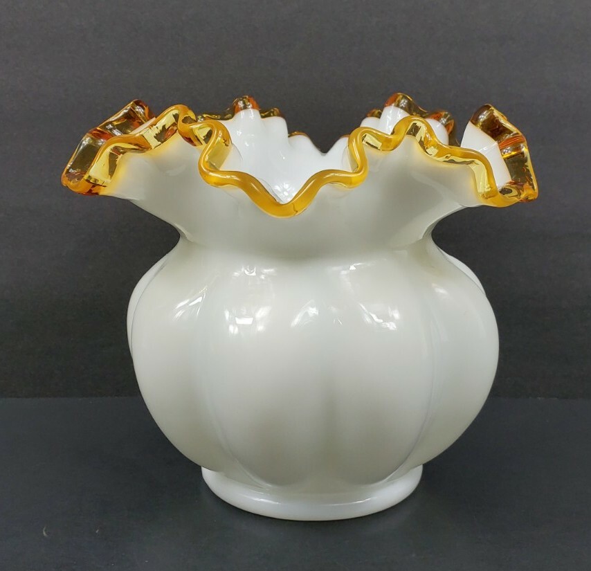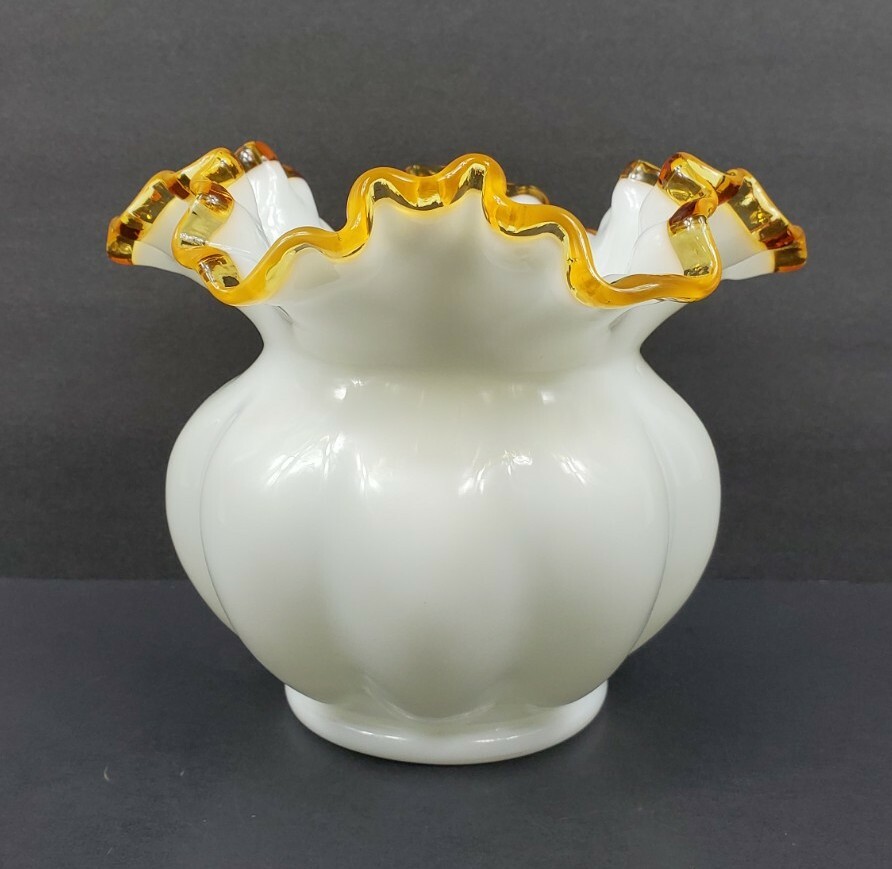 Fenton Milk Glass Amber Gold Crest Double Ruffled Melon Rose Bowl Vase EUC. No chips or cracks. Excellent condition. 6 5/8" wide, 5 1/2" tall. It weighs 1 lb 6.8 oz.