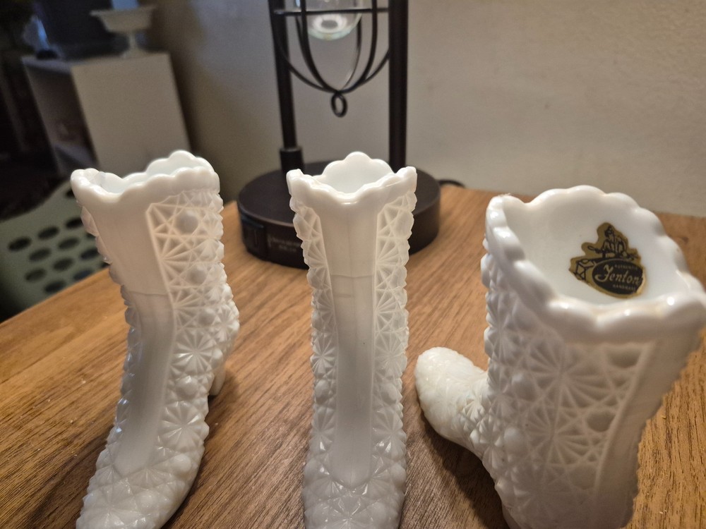 These collectible items are vintage Fenton milk glass boots featuring the Daisy and Button pattern. There are 3 .... Will sell separately or all together. Manufacturer: Fenton Art Glass Company. Material: White milk glass. Pattern: Daisy and Button. Usage: Commonly used as small floral vases, toothpick holders, or decorative figurines