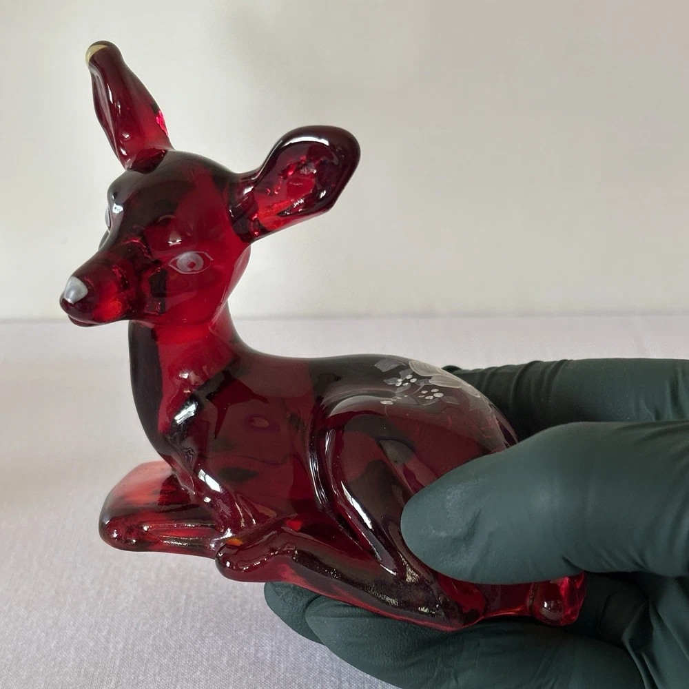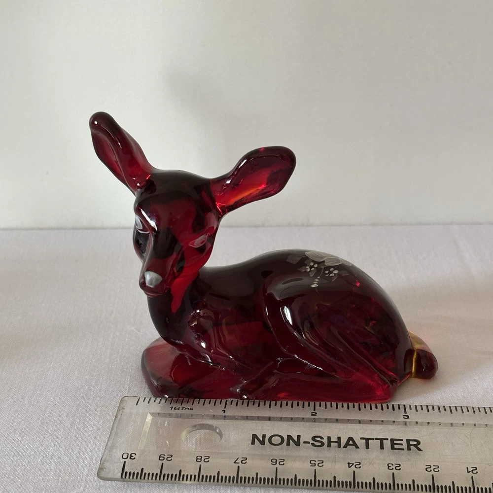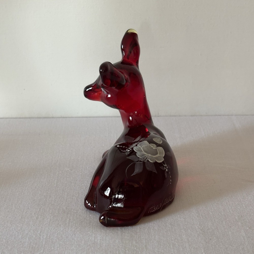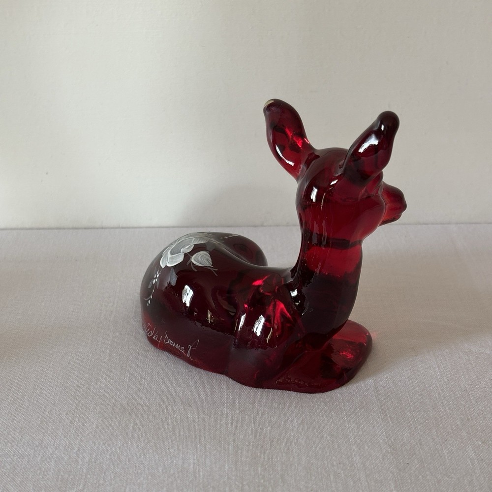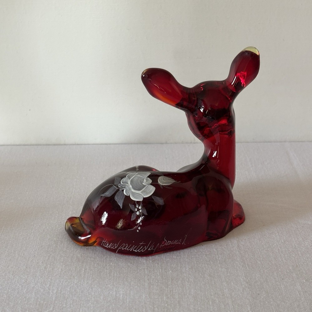 Fenton Ruby Red Glass Deer Figurine – Hand Painted – Signed Donna R or K – Original Labels This listing is for a stunning Fenton ruby red glass deer figurine in a resting pose, featuring hand-painted white floral detailing. The piece is signed “Hand painted by Donna R” or “Donna K” (signature is slightly unclear) and retains both original Fenton stickers on the base. Details: • Deep ruby red glass with rich translucence • Hand-painted white floral motif on the back • Artist signature: Hand painted by Donna R or Donna K • Includes both the “Hand Painted by Fenton” label and partial original Fenton logo sticker • Please refer to photos for exact dimensions and scale Condition: Excellent vintage condition. No chips, cracks, or repairs noted. The paint is crisp and intact. The original labels are present, though one shows some age-related wear. Uses: • A gorgeous addition to any Fenton or art glass collection • Beautiful decor for display shelves, curio cabinets, or holiday scenes • Lovely gift idea for deer lovers, collectors, or as a symbol of gentleness and peace A rare and charming signed piece showcasing the craftsmanship and hand-painted artistry Fenton is known for. ⸻ Welcome to The Gay Delphinium! I offer a variety of vintage items, such as books, toys, and more. These items naturally show signs of age and wear, which adds to their unique charm. What you see in the photos is exactly what you’ll receive. I strive to mention any notable flaws, broken parts, or missing pieces in my listings, but if you have any questions or need more details, please don’t hesitate to reach out. I usually ship within 2–5 business days, but please note that I ship from rural Canada, and while I do my best to get your items to you as quickly as possible, shipping can sometimes take a bit longer, especially during the winter months. Save on shipping by bundling items from my shop! If it doesn’t show up automatically, just send a message and we’ll get it sorted out. If you happen to notice any mislabeling or errors in my listings, I would greatly appreciate you letting me know! Thank you for supporting my shop, and I hope you find something special! Returns & Condition All items are sold AS-IS and described to the best of my ability. Photos are part of the description, please review them carefully and ask any questions before purchasing, especially if you have dealbreakers. By completing a purchase, you acknowledge that you have read the full description and examined all photos. Minor variations, wear, or imperfections shown in the photos are considered part of the item?s condition and are not grounds for return. Vintage and used items may show signs of age consistent with their history; these characteristics are not considered defects. Return Policy I do not accept returns unless there is a clear and significant difference between the item received and the listing description/photos. Returned items must be received in the same condition as sent, with all original parts and packaging. Refunds may be reduced or denied if the item is returned altered, incomplete, or damaged. Serial numbers and identifying marks are recorded for verification. Packaging & Shipping Items are packed securely and shipped with tracking. Please inspect packages upon delivery and report any shipping damage within 48 hours.