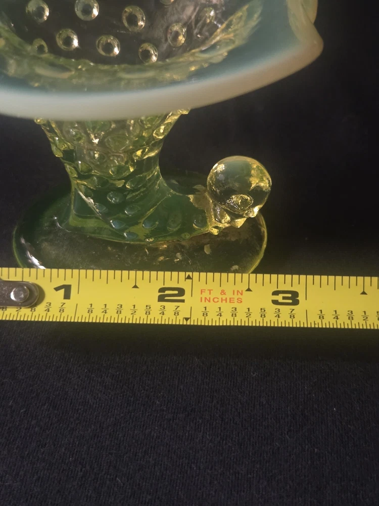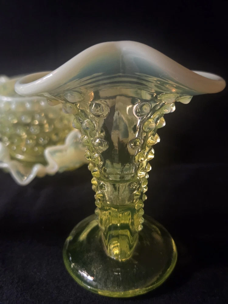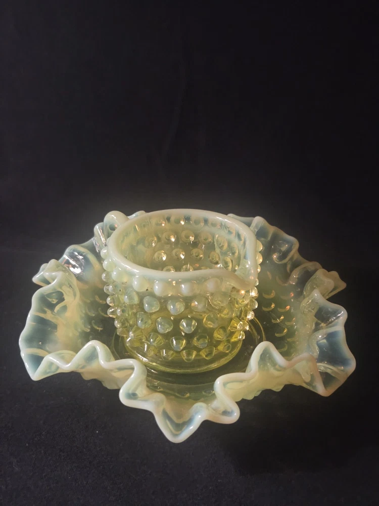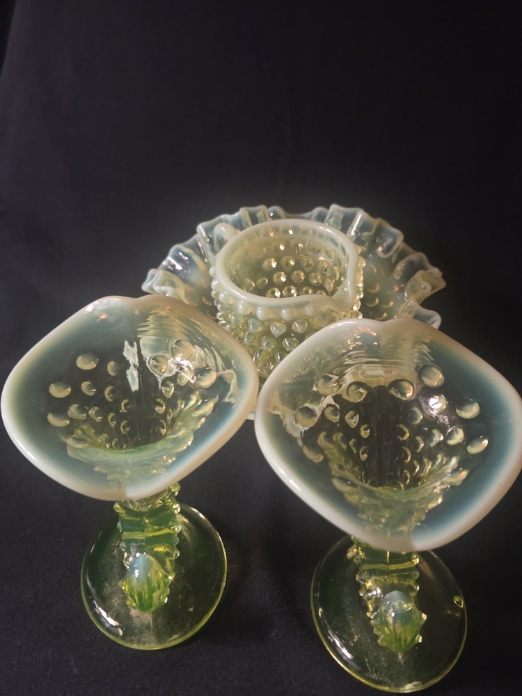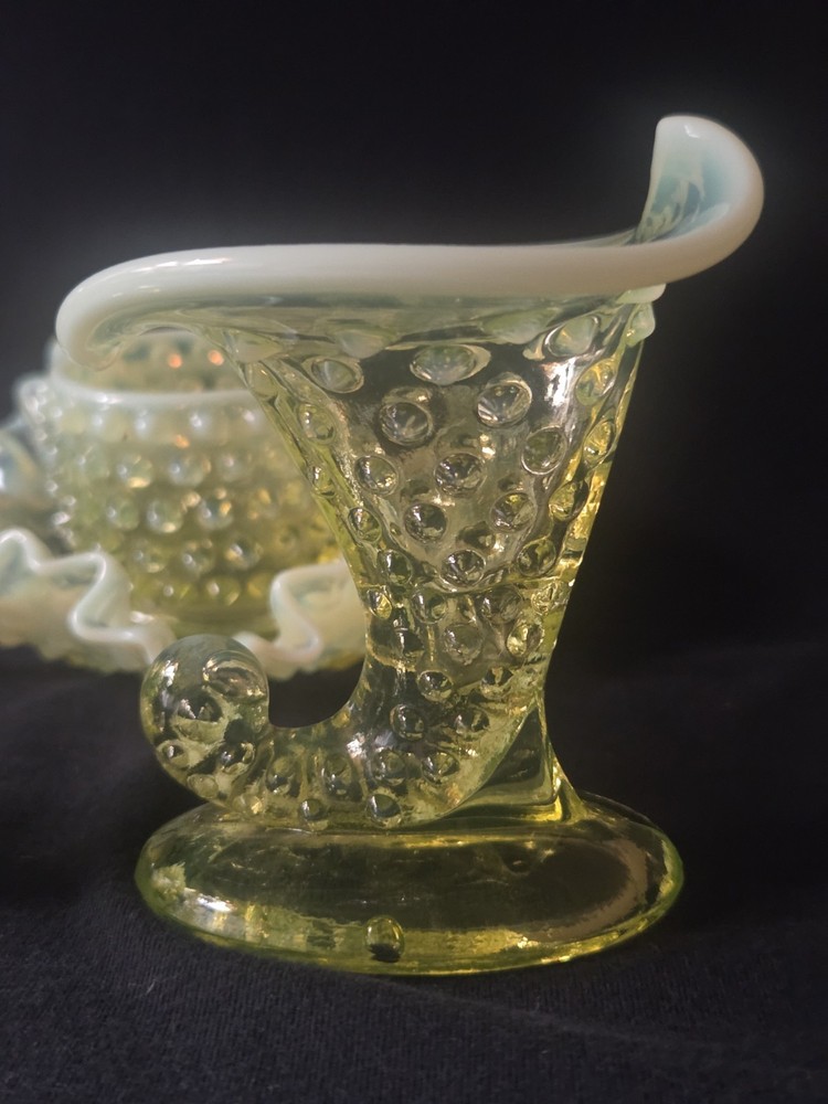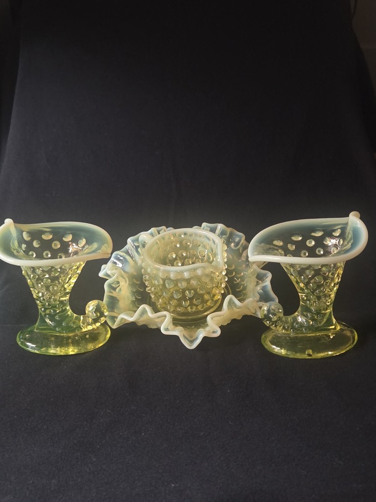 MINT CONDITION NO CHIPS NO CRACKS The Fenton SET Topaz Uranium Opalescent Hobnail Dish, Cup, and Two Cornucopia is a stunning collection of decorative glass pieces made in the United States. Featuring a beautiful topaz yellow green color, these original pieces are crafted with intricate hobnail details and a unique uranium opalescent design. Perfect for collectors or those looking to add a touch of vintage charm to their home decor, this set is a true testament to Fenton's craftsmanship and artistic flair.