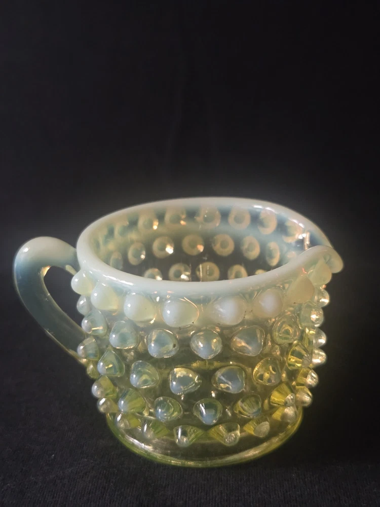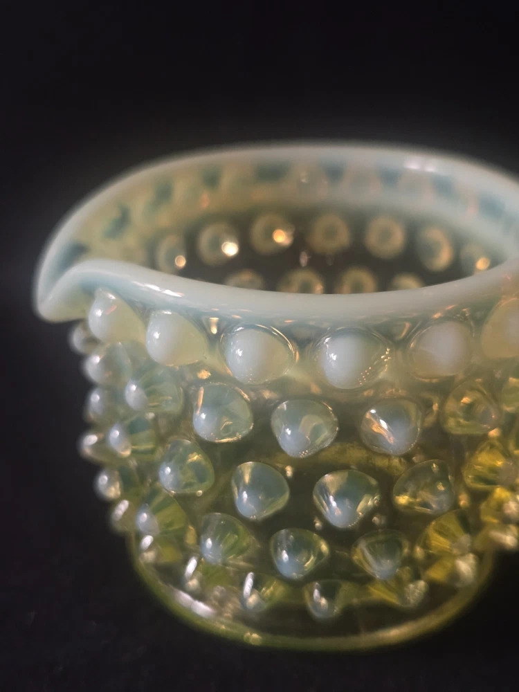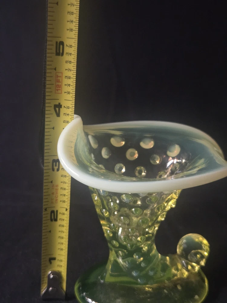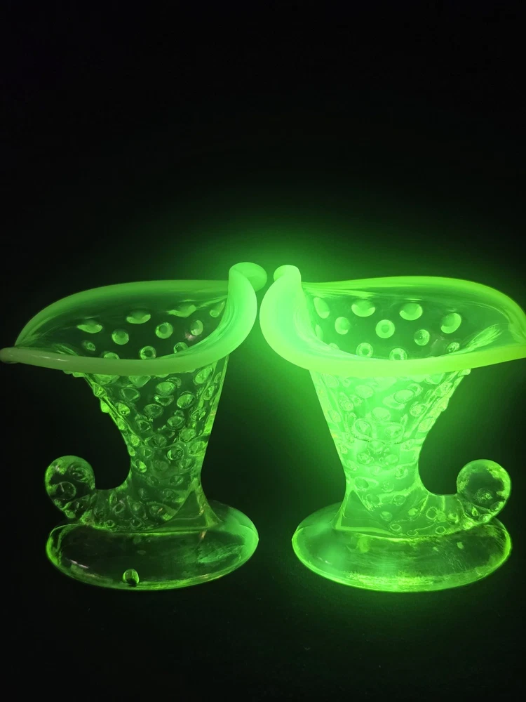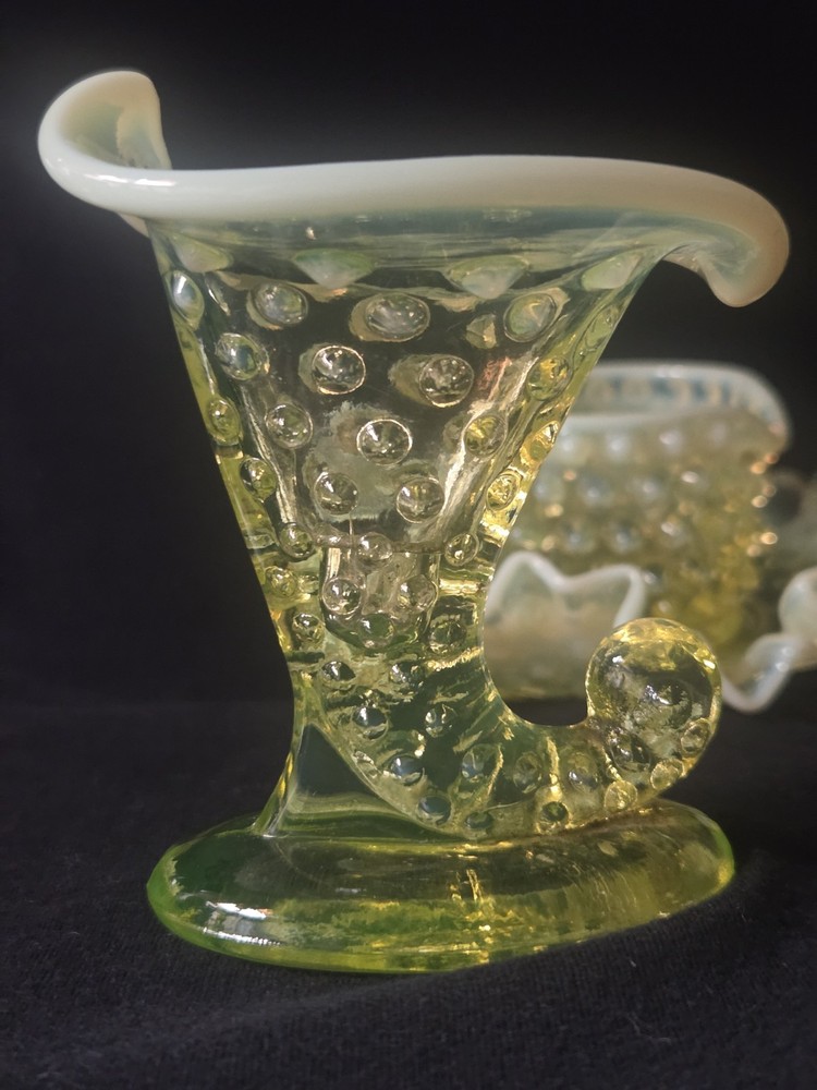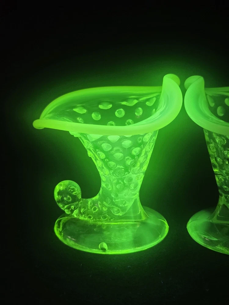 MINT CONDITION NO CHIPS NO CRACKS The Fenton SET Topaz Uranium Opalescent Hobnail Dish, Cup, and Two Cornucopia is a stunning collection of decorative glass pieces made in the United States. Featuring a beautiful topaz yellow green color, these original pieces are crafted with intricate hobnail details and a unique uranium opalescent design. Perfect for collectors or those looking to add a touch of vintage charm to their home decor, this set is a true testament to Fenton's craftsmanship and artistic flair.