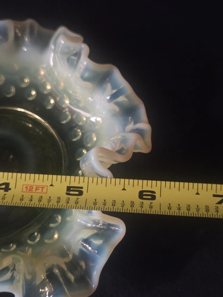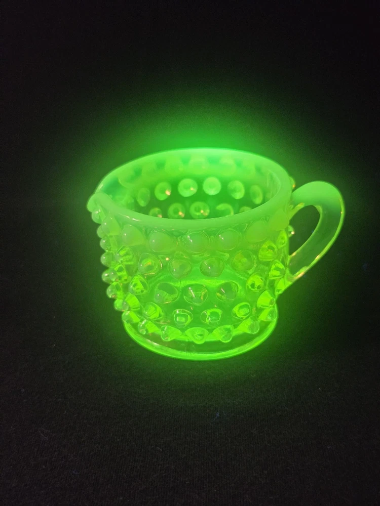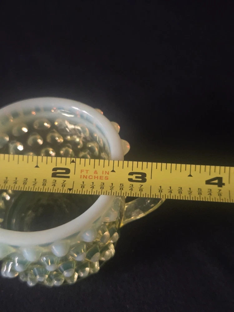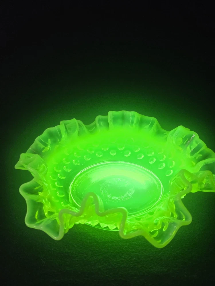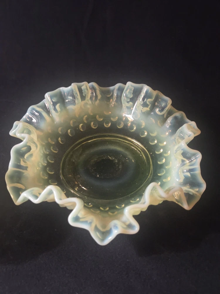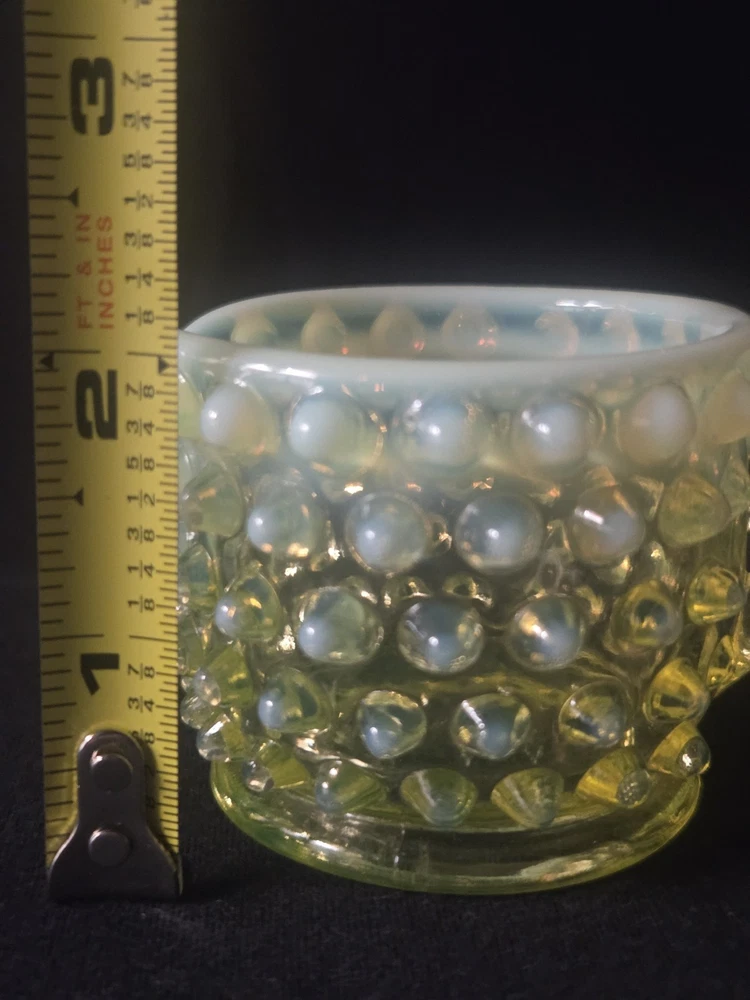 MINT CONDITION NO CHIPS NO CRACKS The Fenton SET Topaz Uranium Opalescent Hobnail Dish, Cup, and Two Cornucopia is a stunning collection of decorative glass pieces made in the United States. Featuring a beautiful topaz yellow green color, these original pieces are crafted with intricate hobnail details and a unique uranium opalescent design. Perfect for collectors or those looking to add a touch of vintage charm to their home decor, this set is a true testament to Fenton's craftsmanship and artistic flair.