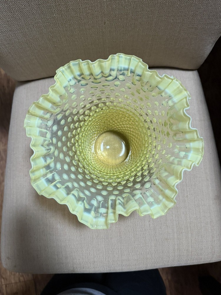 Size: Large Era: Mid 20th Century (1941-1969) Finish: opalesent Year Manufactured: 1940 Type: Vase Care Instructions: Clean with Damp Cloth Occasion: All Occasions Brand: Fenton Pattern: Ruffled Production Technique: Hand Blown Glass Material: Glass Original/Reproduction: Original Vintage: Yes Time Period Manufactured: 1940-1949 Glassmaking Technique: Hand Blown Packaging: Box Origin: North American Country of Origin: United States Signed: No Style: The Great Depression Color: Yellow