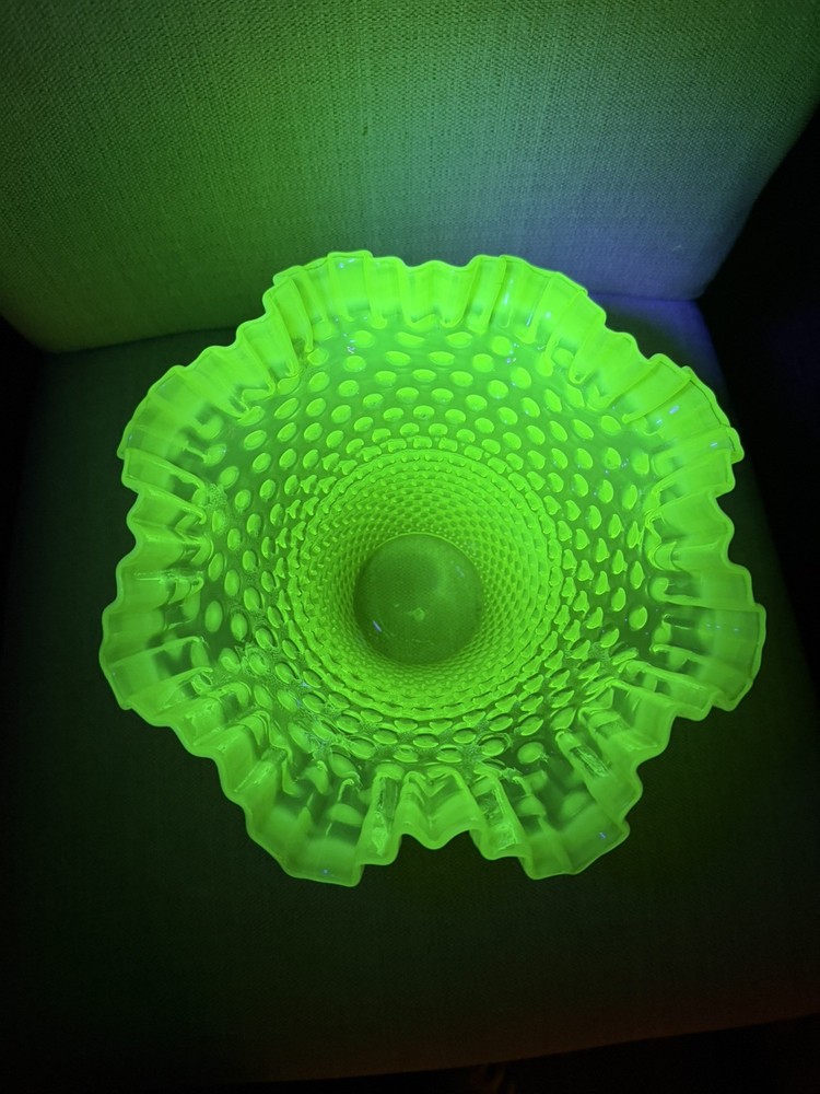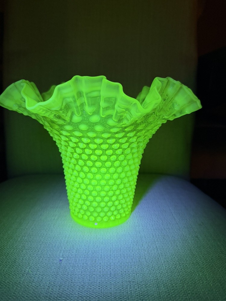 Fenton Uranium Glass Hobnail Vase with Beautiful Ruffled Top RARE
