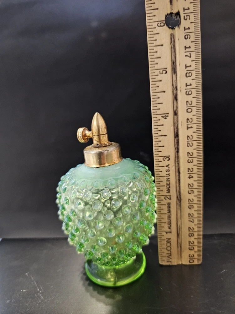 $ 52.8Fenton Uranium Glass Perfume Bottle DeVilbiss Green Opalescent Hobnail With Bulb