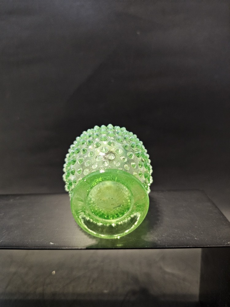 In excellent condition. No chips or cracks The Fenton Uranium Glass Perfume Bottle is a beautiful piece of collectible vanity ware, handmade in the United States. This green opalescent hobnail bottle is a classic example of art glass from the renowned Fenton brand. The intricate design and historical significance of this piece make it a sought-after item for perfume collectibles enthusiasts.