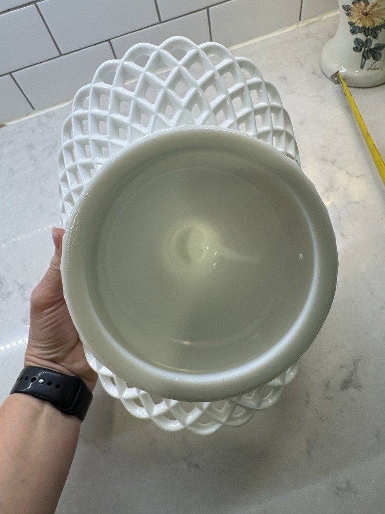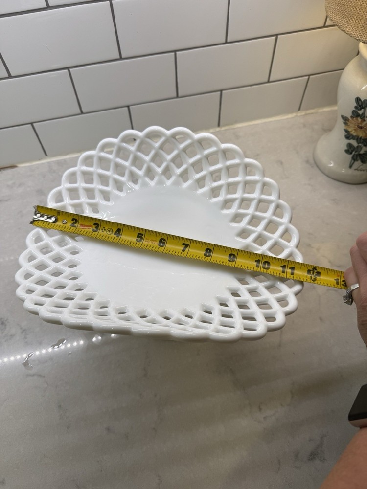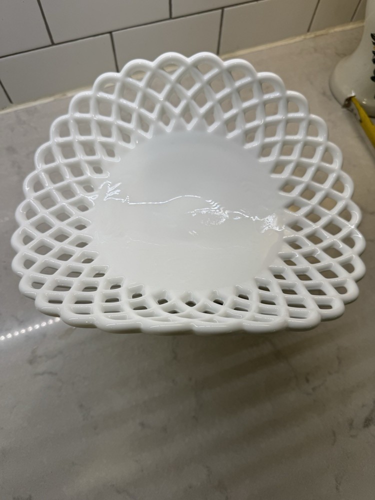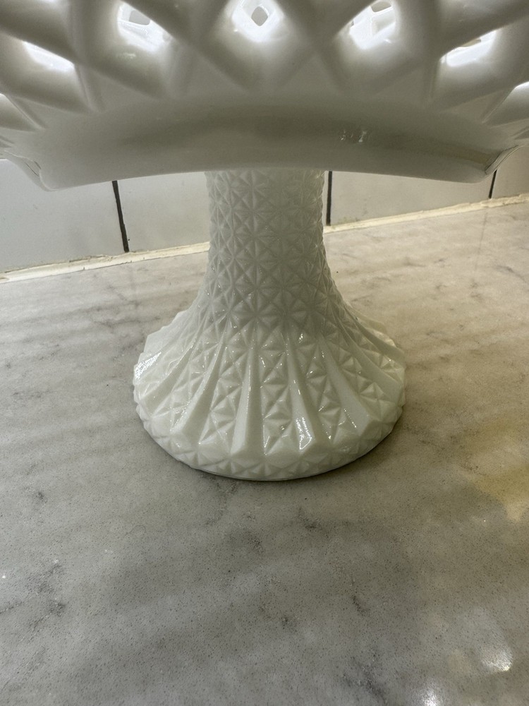The product is a rare vintage Fenton white milk glass lace banana boat cake plate compote stand. Made by the renowned brand Fenton, this cake stand features a classic white color and is crafted from milk glass, giving it a unique and elegant look. Its intricate lace design adds a touch of sophistication to any dining or display setting, making it a rare and sought-after piece for collectors orThose looking for a vintage touch to their home decor.