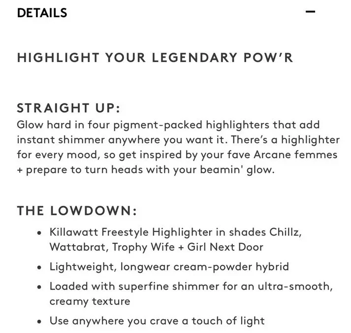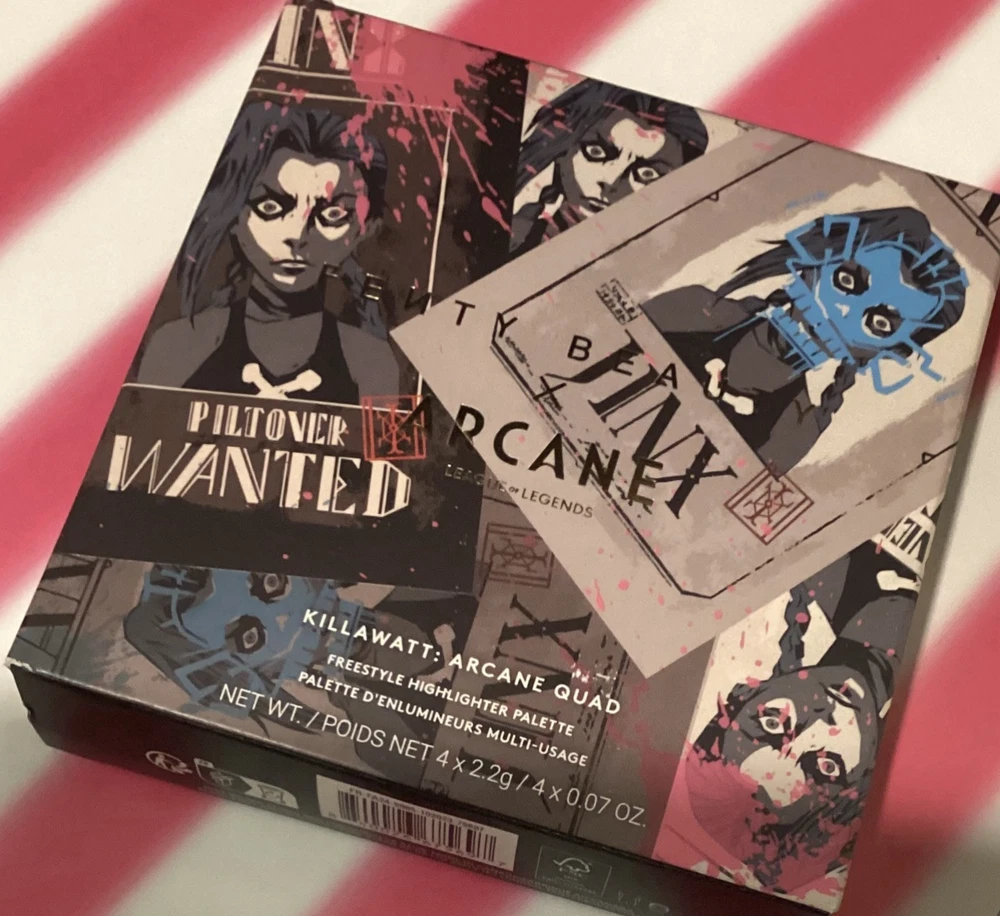 Fenty Beauty x Arcane League Of Legends KILLAWATT: ARCANE QUAD HIGHLIGHTERS ~ Rare Limited Edition Set * New in Box! KILLAWATT: Arcane Quad FreeStyle Highlighter Palette Details: 4 Highlighters Inspired by Arcane character Jinx Colors/Shades : GIRL NEXT DOOR ( Soft Pink Sheen ), WATTABRAT ( 3D Baby Pink Shimmer ), TROPHY WIFE ( 3D Hyper- Metallic Gold ), CHILLZ (Iridescent Baby Blue Shimmer) Lightweight, longwear cream-powder hybrid Loaded with superfine shimmer for an ultra-smooth, creamy texture Use anywhere you crave a touch of light Size/ Fill Weight: .07 oz / 2.2 g each x 4 (= .28 oz / 8.8 g Total) ***Please see pictures and “Item Specifics” for more details/description Thank You For Looking :)