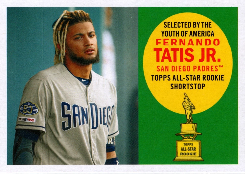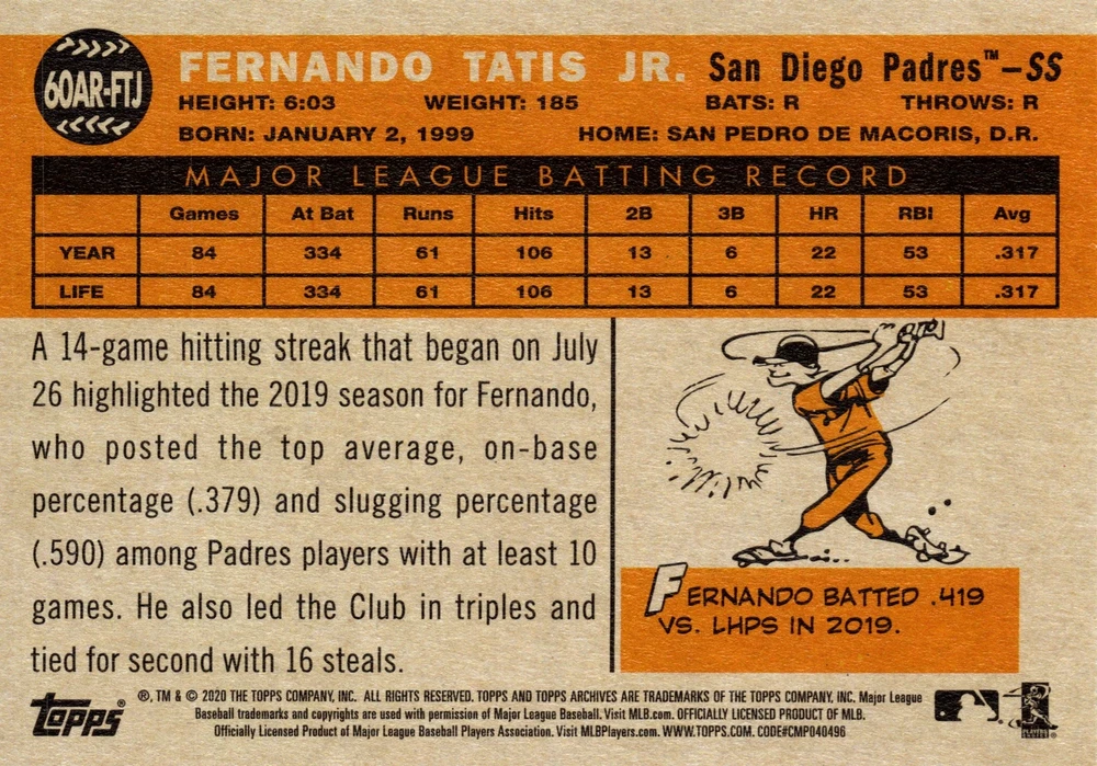The product is a 2020 Topps Archives trading card featuring Fernando Tatis Jr. from the San Diego Padres. This rookie card is part of the 1960 All-Star Rookies insert set and is an original licensed reprint. The card is made of card stock in standard size and is in English. The card number is #60AR-FTJ, and it is a collectible sports trading card for MLB fans.