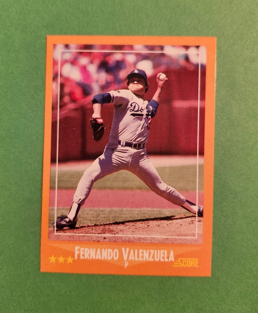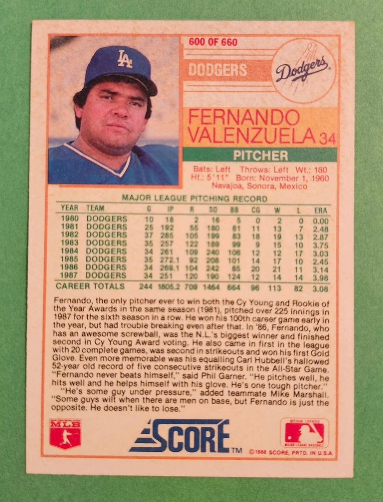 Card Number: 600 Autographed: No Player/Athlete: Fernando Valenzuela Sport: Baseball Season: 1987 Manufacturer: SCORE Features: Base Set League: Major League Baseball (MLB) Team: Los Angeles Dodgers, San Diego Padres, Philadelphia Phillies, Baltimore Orioles Year Manufactured: 1988 Set: 1988 Score Type: Sports Trading Card