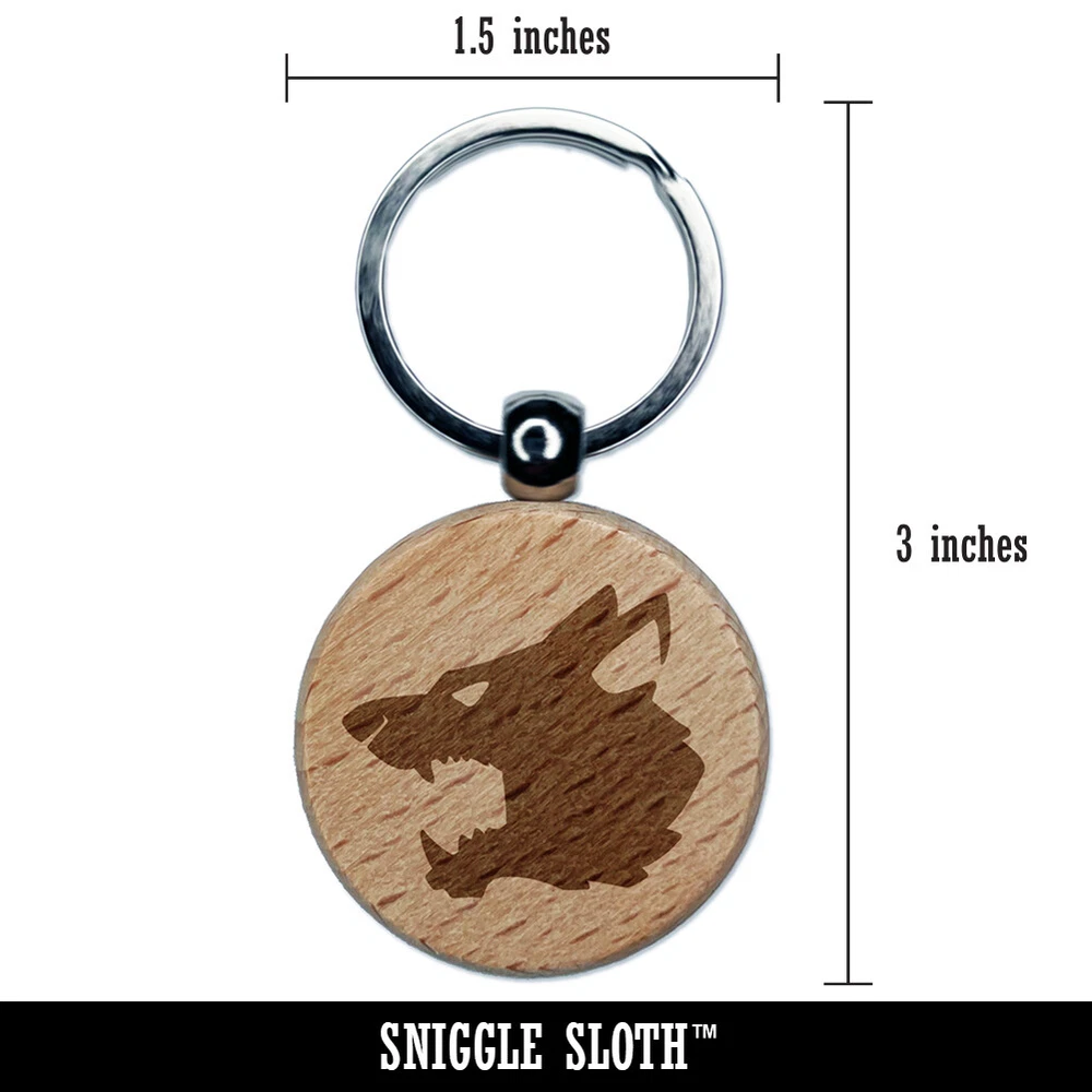Ferocious Snarling Wolf Head Side Engraved Wood Round Keychain Tag Charm