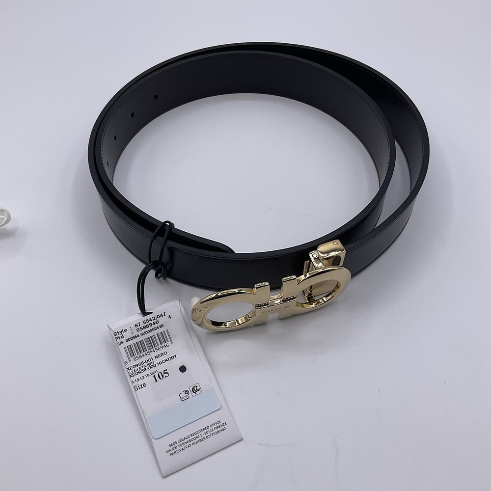 You are looking at a Ferragamo Reversible Leather Gancini Belt Size 105 This item is brand new. The item you will receive is exactly as shown in the pictures. Please refer to all the photos for full details! About Us Customer service is our #1 priority! If for any reason you are dissatisfied with your purchase we offer a 30 day money back guarantee unless otherwise noted in the listing (AS-IS/For Parts - No returns.) We only accept items back in the condition that they were sent to you. Items that are listed AS-IS are not eligible for this money back guarantee. If you are unhappy with your purchase PLEASE contact us BEFORE leaving feedback or contacting eBay so we can work with you to resolve any problems. Shipping When we charge shipping to our customers we only pass on to our buyers exact shipping costs - no added fees. We offer combined shipping for multiple items purchased, so if you purchase more than 1 item from us, please wait for us to combine shipping costs. We require signature confirmation on all items that sell for $750.00 & more per eBay's selling policy. We also insurance all items that sell for $250.00 & more. PLEASE NOTE: WE DO NOT WORK/SHIP ON HOLIDAYS OR WEEKENDS! We use the eBay Global Shipping program for international shipping. DLLR License #991 Please note, we are not an authorized distributor or manufacture's representative of this item. *This product may contain a chemical known to the state of California to cause cancer and birth defects or other reproductive harm*