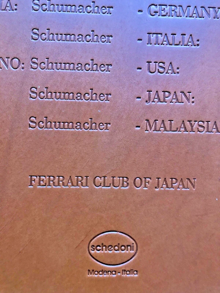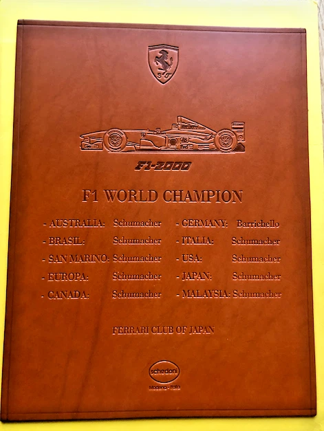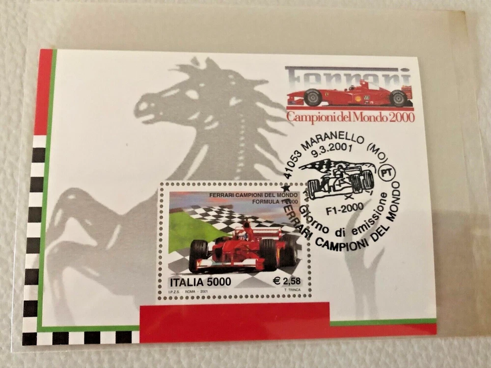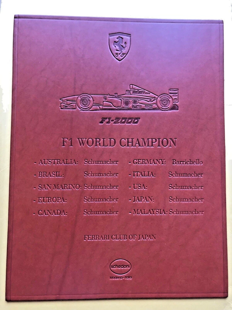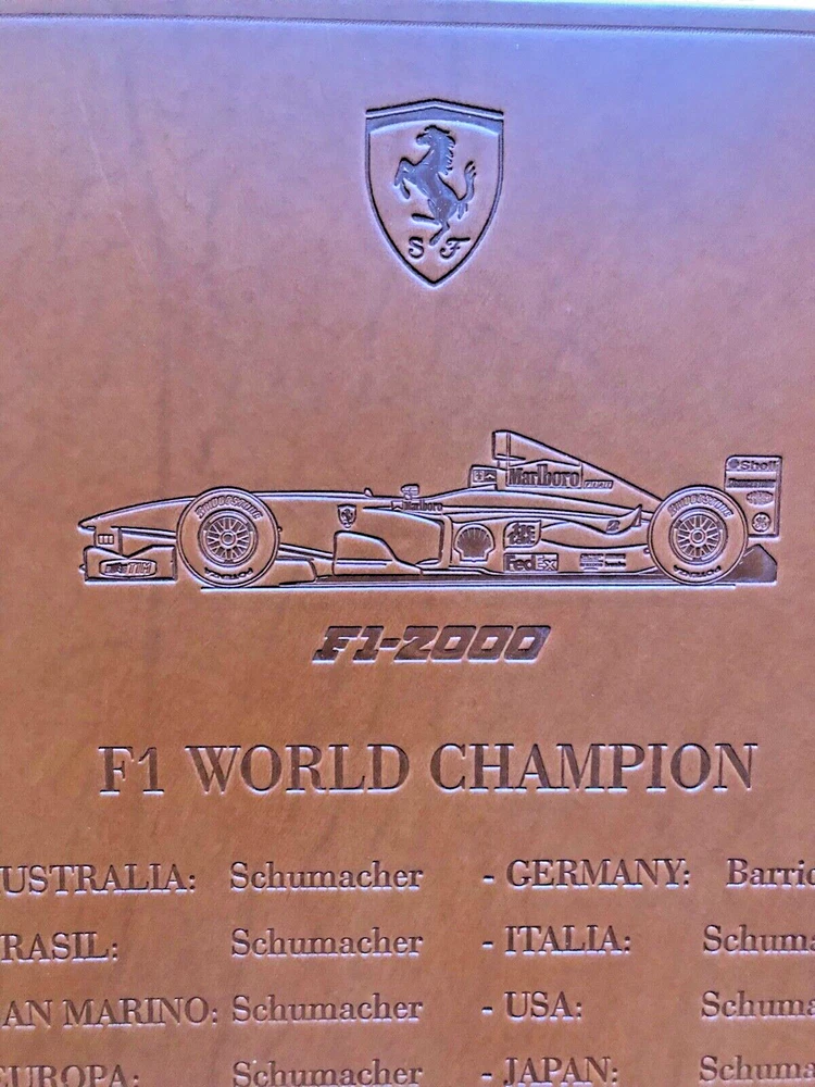 Schedoni collector's plaque "Ferrari F1 2000" created by Schedoni for the Ferrari Club of Japan celebrating Michael Schumacher's world champion title (and constructor title for Ferrari) in 2000. New condition. Also, a new collectible stamp protected in a blister, celebrating Ferrari's World Champion title from year 2000 and stamped from the city of Maranello, dated 03/09/2001. Please message me before buying.