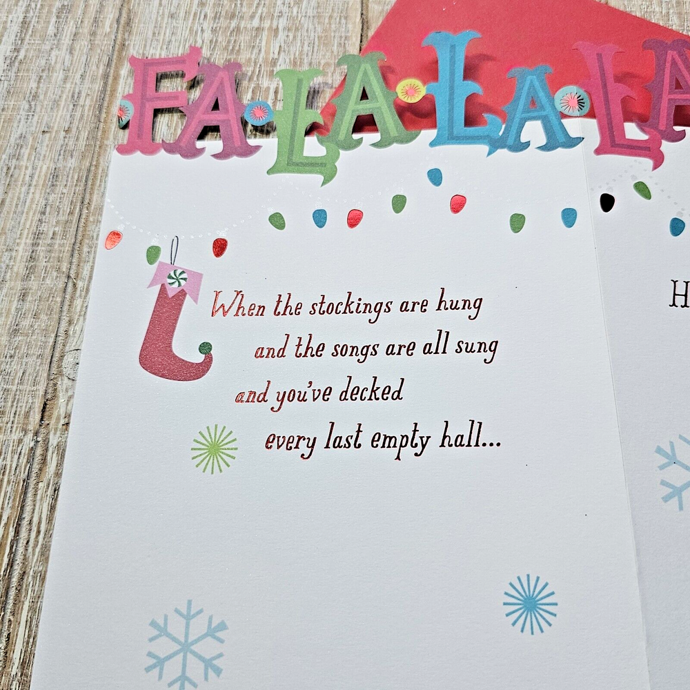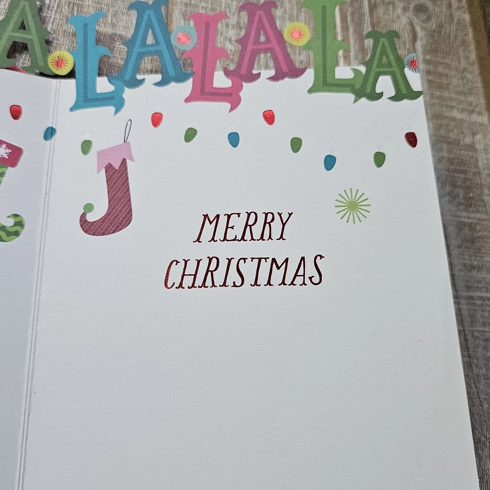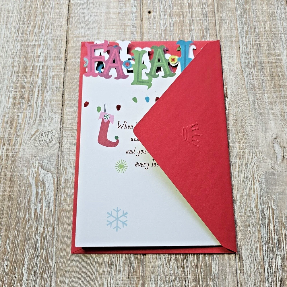 Hallmark Christmas Greeting Card Fa La La Tri Fold Die Cut Lights Glitter Full Size 5.5 x 8 inch card with matching envelope Condition: new Search thousands of cards for all occasions in our eBay Store. **This items ships with limited tracking via USPS First Class.** **The standard time is 5-7 business days for delivery but it may take up to 10 days.**