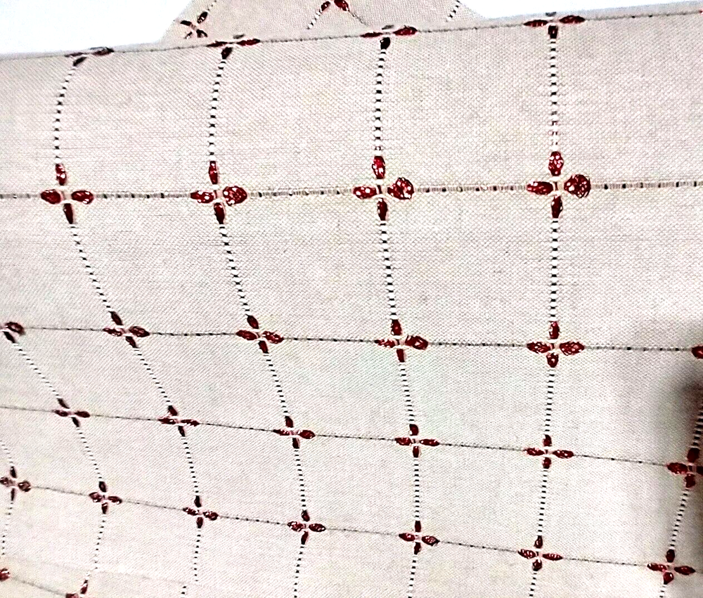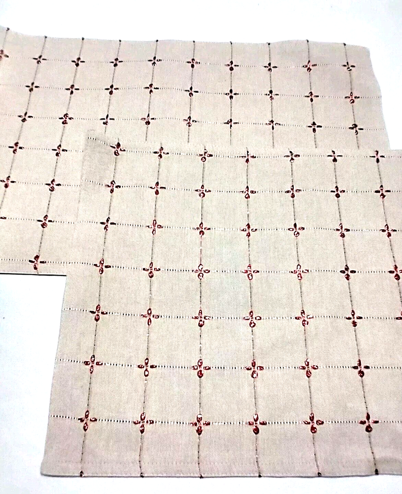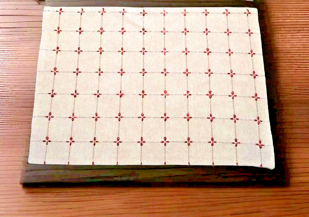 This is a gently pre-owned Set of 2 Christmas / New Years Placemats in very good, like new, condition. Features embroidered red metallic thread starbursts (very sparkly) on beige background. They measure approximately 19.5" in length and 13.25" in width. They are 75% Cotton, 20% Polyester, and 5% Metallic Thread. They are machine washable in cold water. Very Nice Quality! PLEASE SEE ALL PICTURES AS PART OF THE DESCRIPTION.