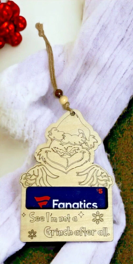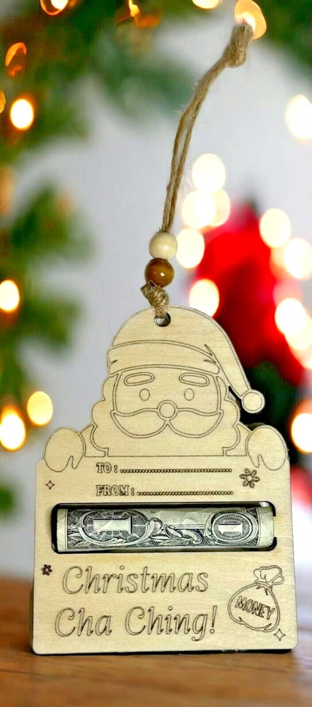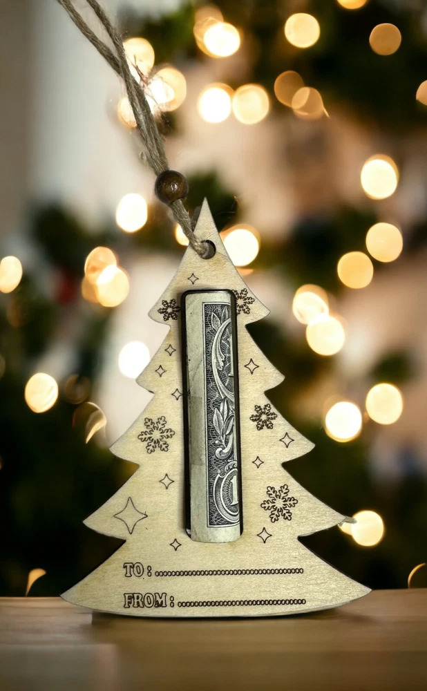 The Christmas Gift Card/Cash Holder Ornament is unfinished, sanded, and ready to paint. It is laser cut from 1/8” Baltic birch plywood. We cut everything with our Laser. All pieces come separately so that you can paint and glue them together. These are great for teacher gifts, nurse gifts, office gifts, and so on! Paint them up yourself, slip a gift card or cash in, and hang them on the tree! Easy! It makes a cute ornament for the recipient for next year! ***GIFT CARD / CASH NOT INCLUDED*** ** items are unfinished** No decorating supplies are provided (i.e., paint, glue, etc.).