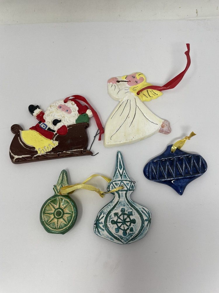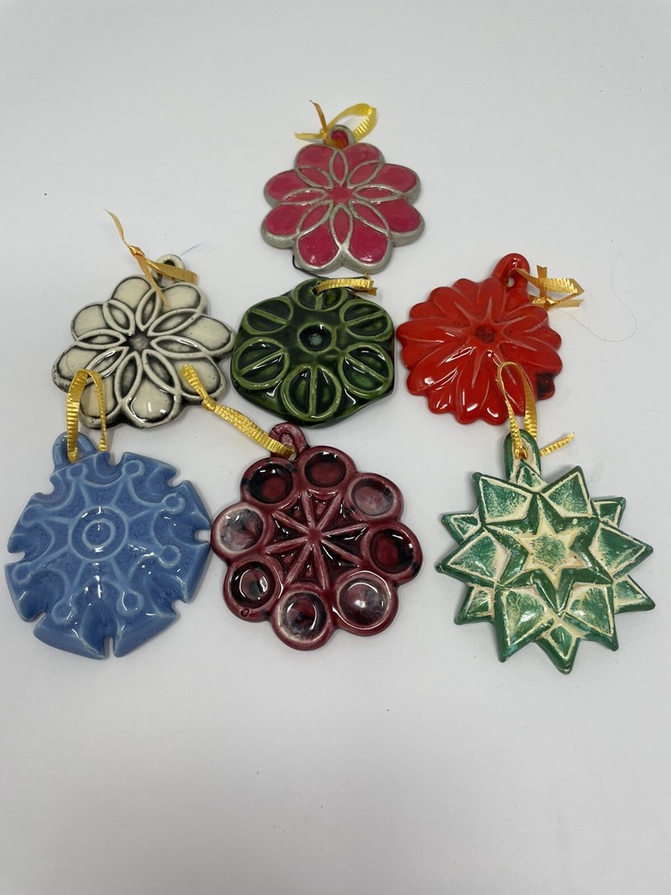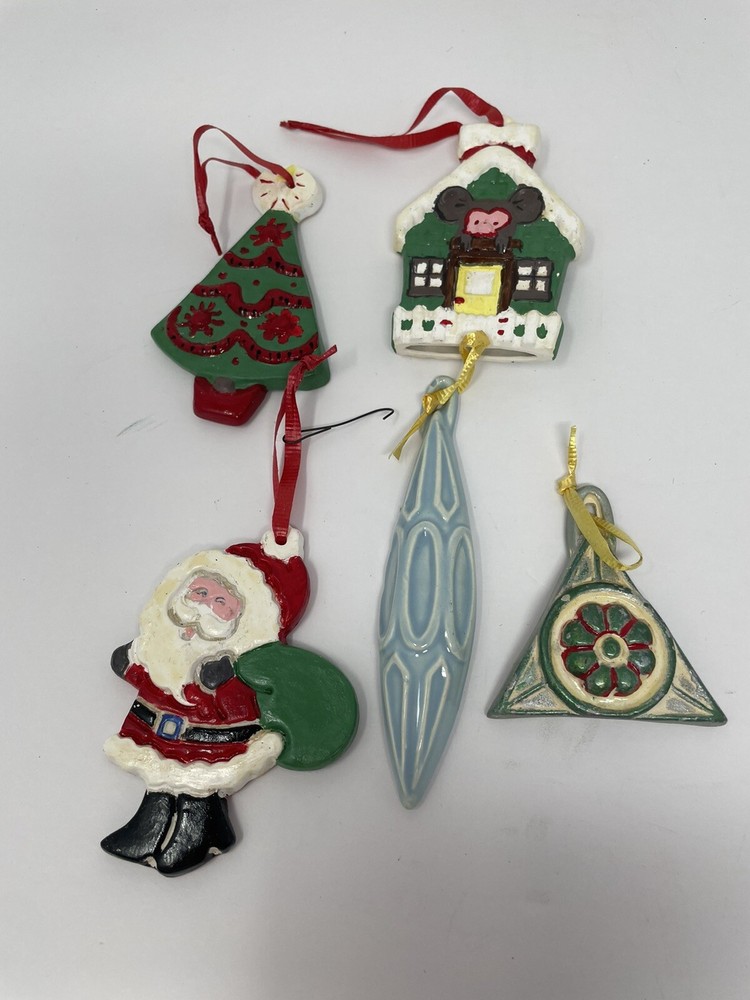 Lot of 17 ceramic Christmas tree ornaments. Assorted shapes, sizes, and colors. All in good condition. No chips or cracks.