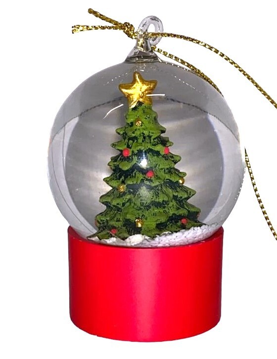 SEASONAL ABODE NEW WITH TAG Classic green Christmas tree with red base snow water globe ornament. 3" high Inv: 734334-347, 734399 [B77]
