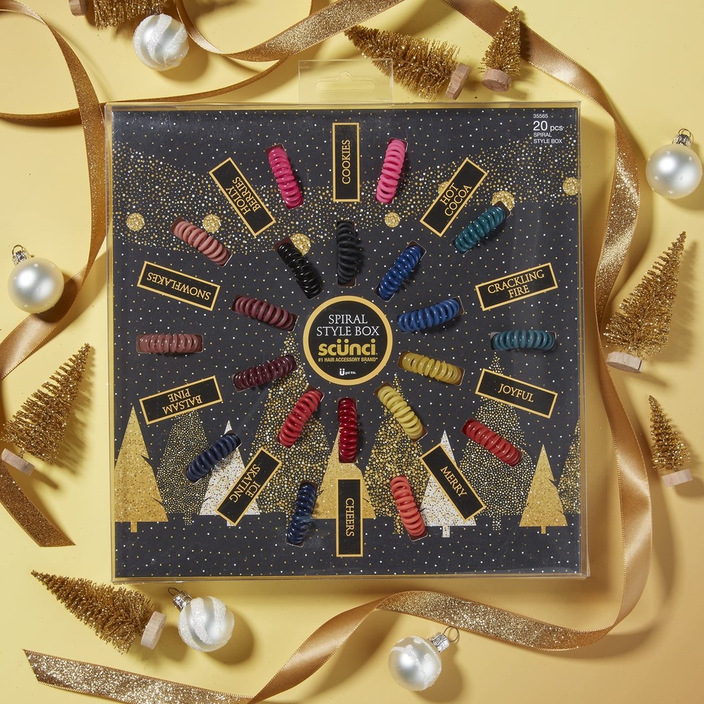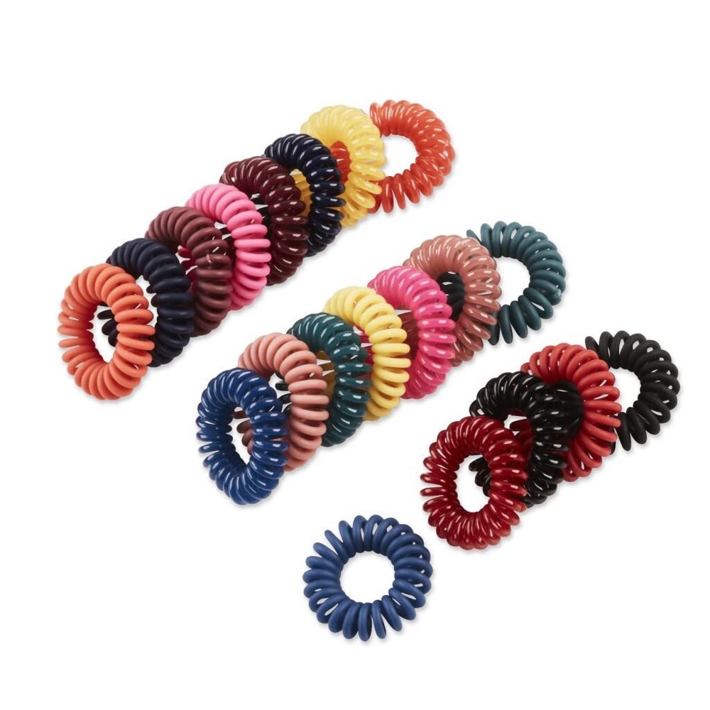 Tame your tresses with a few twists of fun and festive spirals specially designed for maximum elasticity and dent-free, all-day hold. This 20-pack in assorted colors ensures you always have plenty on hand to tame your mane and banish bad hair days forever. Available in light pink, coral, green, sage, navy, berry, black, blue, gold, and red, these essential spirals stretch wide and return to original size with a secure yet gentle hold that doesn’t or damage hair. Perfect for a fun twist on ponytailing, they double as on-trend wrist accessories. 20 spirals with secure, dent-free hold—no or damage Fun and festive assortment—light pink, coral, green, sage, navy, berry, black, blue, gold, and red accessories in —each spiral hair tie doubles as a wristie Perfect as a holiday gift—for friends, family, or yourself!