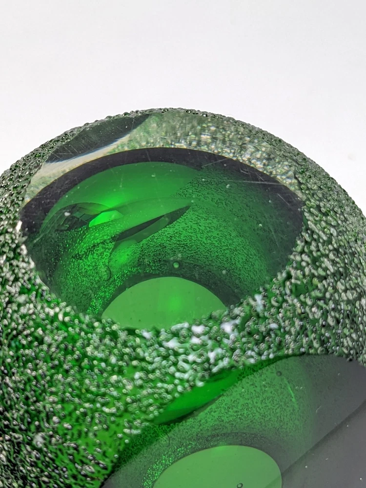 This stunning vintage votive candle holder was distributed by Fifth Avenue Crystal, dating back to the 1970s. This exquisite piece features a unique "geode" design, showcasing a vibrant green interior encased in clear glass with a thick sugared or frosted texture. The holder is elegantly crafted with sliced windows on two sides, allowing the enchanting green hue to radiate beautifully when illuminated. Specifications: Width: Approximately 4 inches Height: Approximately 3 3/8 inches Elevate your home decor with this timeless candle holder that combines vintage charm with modern elegance, perfect for adding a touch of sophistication to any space. Pre-owned item, used condition showing signs of wear and use. No chips, cracks, or repairs. Missing brand label. All images provided accurately represent the item(s) you will receive and should be regarded as an integral part of the description. We encourage you to carefully review each image. If you have any questions or need further details about this listing, please feel free to reach out to us.