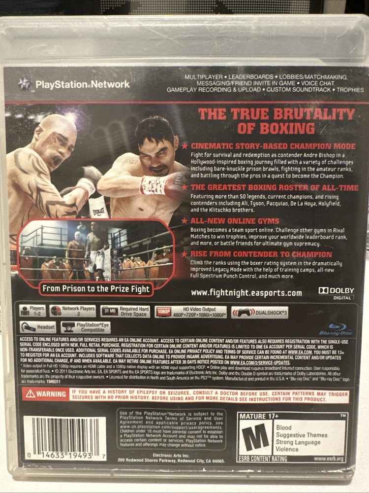 Fight Night Champion is a sports video game part of the Fight Night series by EA SPORTS. Released in 2011 for Sony PlayStation 3, the game features boxing gameplay and is rated M for Mature players.