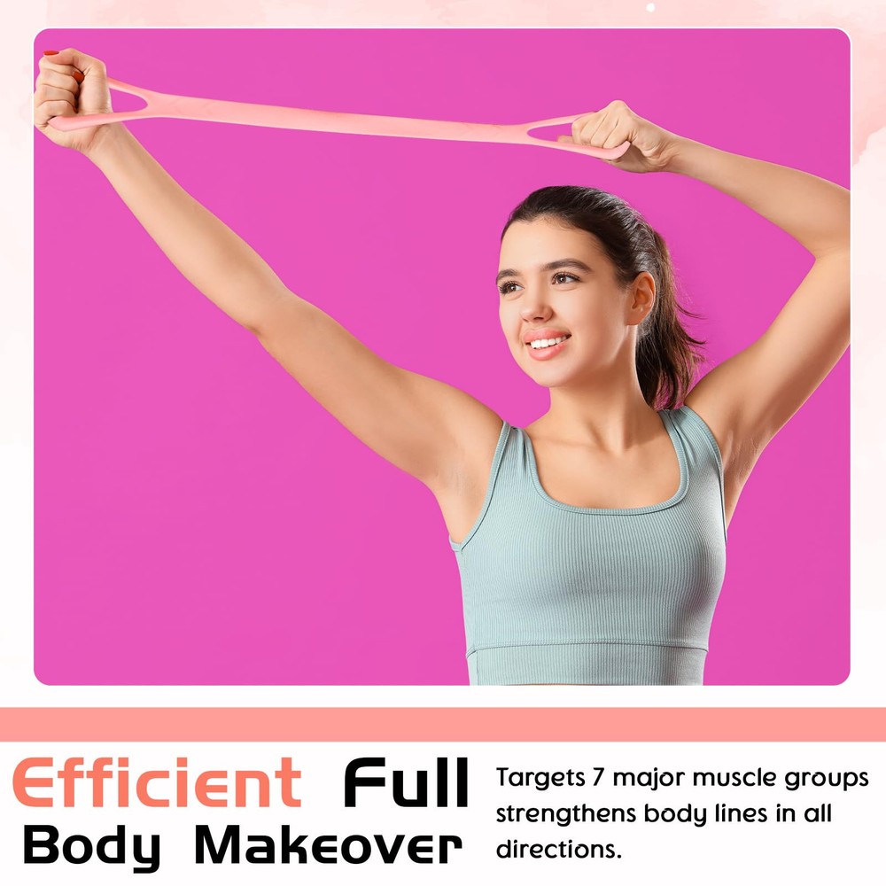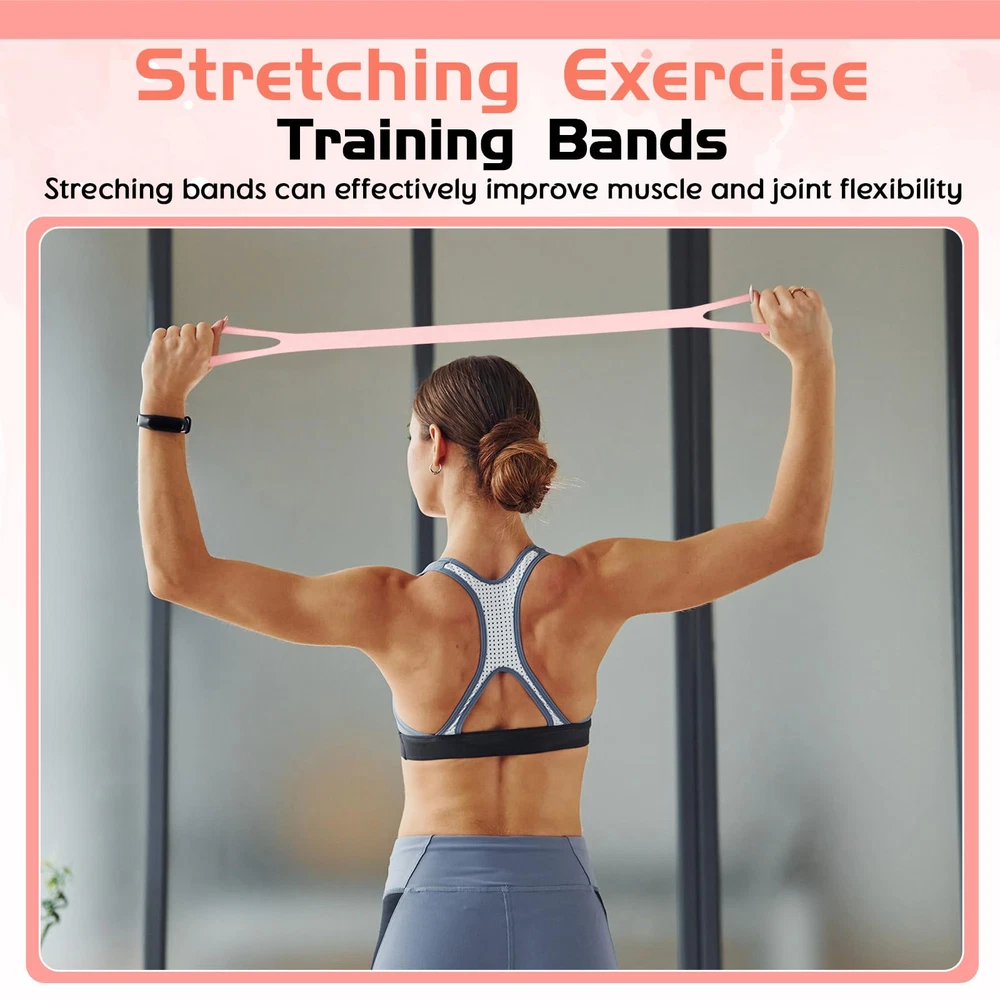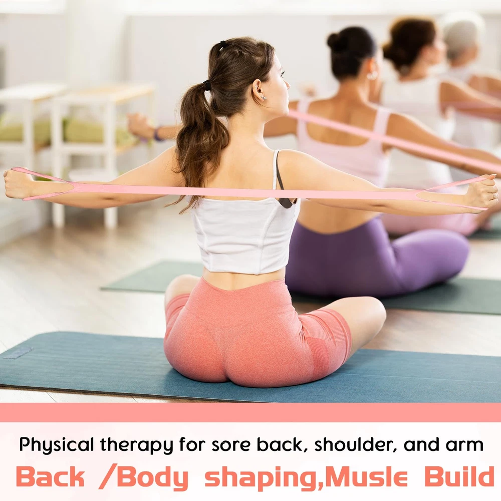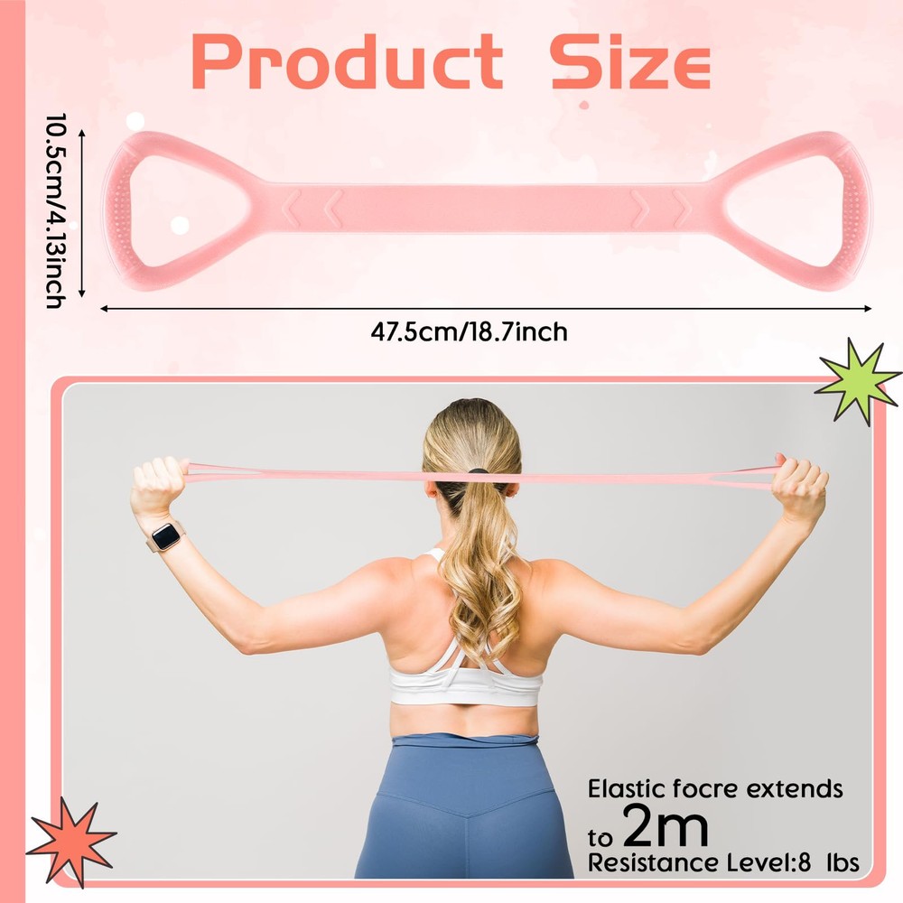 Features: Multifunctional resistance band for body sculpting. Helps improve posture by opening up shoulders for an attractive back, works out chest and arms to improve temperament, aids in correcting inappropriate sitting postures and prevents occupational diseases. The elastic rope also plays a key role in fat burning and weight loss. The elastic band stretcher is made from natural latex with a figure-8 design for thoughtful fitting and to reduce hand strain and prevent friction damage. Specifications: Material: natural rubber Color: pink Size: about 47.5 x 10.5 cm/ 18.70 x 4.13 inch Package includes: 1 x Figure 8 fitness resistance band Notes: Manual measurement, please allow slight errors on size. The color may exist a slight difference due to different screen displays. Reliable Material: our resistance band with handles is made of silicone; It boasts elasticity, strong tensile strength, and resistance to breaking; The figure 8 resistance band can stretch up to 2 meters, making it ideal for girls, elderly, or fitness enthusiasts looking for the thoughtful stretching tool Effective Physical Pain Relief Tool: regular usage of the figure 8 resistance band for stretching exercises can help alleviate body pains like those in your back, arms, neck, upper body, or shoulders; It's suitable for those often working at a desk, experiencing body fatigue, or those not passionate about extensive workouts but still want to participate in sports activities Daily Fitness Equipment: the elastic band can also serve as an essential tool for your daily stretching exercises; It will assist you in shaping and adjusting your posture, and increasing strength in your legs, arms, and feet; It even aids in enhancing muscle strength; Hence, this stretching band is the optimal choice for activities like yoga, Pilates, or any fitness enthusiasts Portable and Convenient: with its anti slip handles, the elastic band for exercise is compact, lightweight at 0.26 pounds, and easy to carry; You can easily exercise indoors, outdoors, at home, the office, or even while seated! The material is soft and comfortable to touch, and easy to clean; Let this band accompanies you anywhere you go Exercise Anywhere: the fitness band is designed for easy and quick mobility; You can roll it up and store it in your fitness bag, briefcase, or even take it along on an overnight trip; It is ideal for home or gym workouts