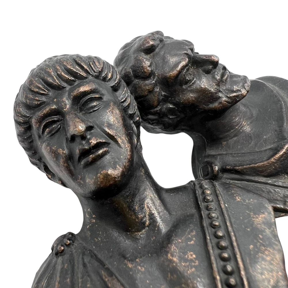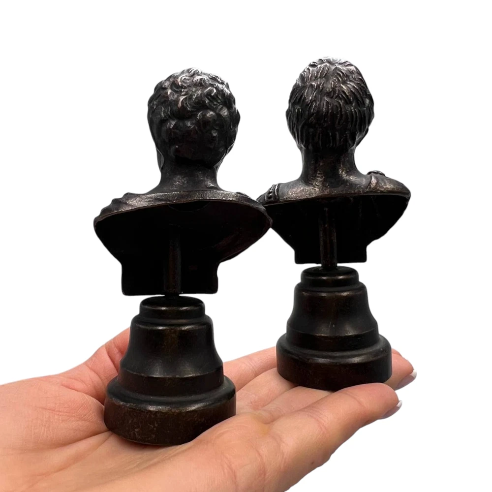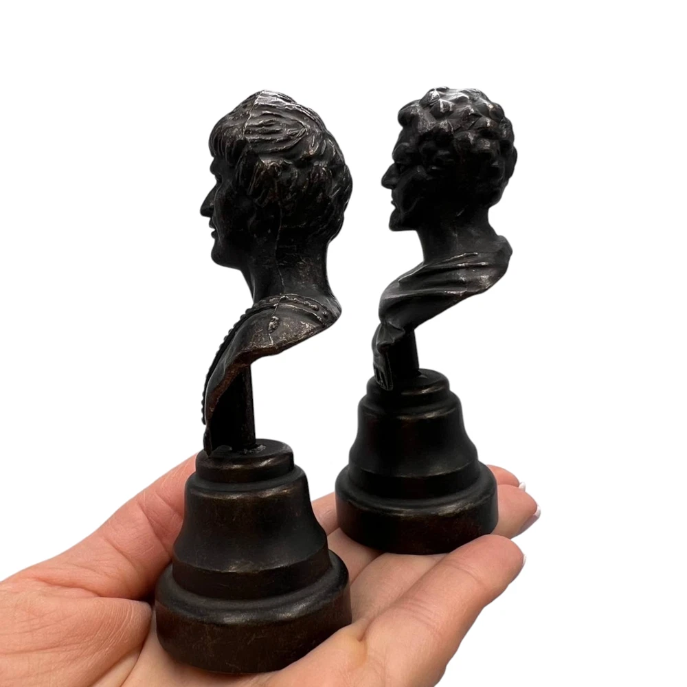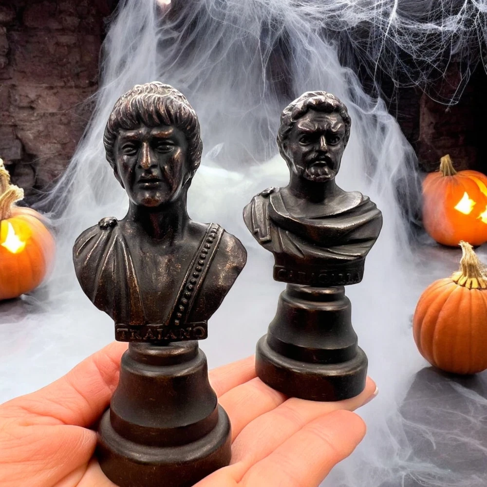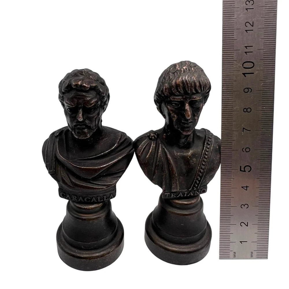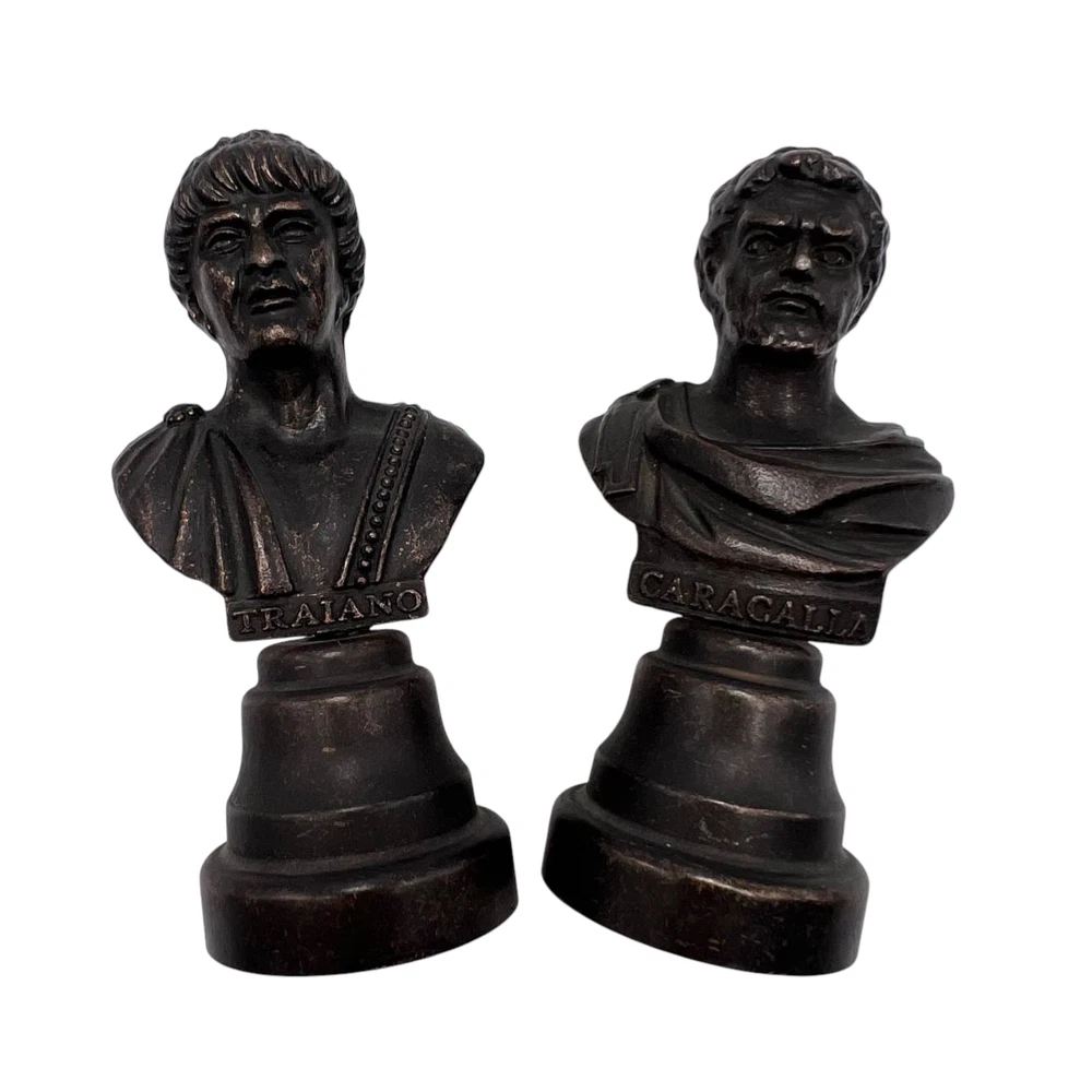 Elevate your collection with these exquisite vintage collectible metal busts featuring two iconic Roman Emperors: Caracalla and Trajan. These detailed miniature statues are meticulously crafted, capturing the unique characteristics of each emperor with historical accuracy. Made of durable metal, they exhibit a refined antique finish, embodying the timeless allure of ancient Rome. Each bust stands firmly on a solid base, perfect for display on shelves, desks, or in curio cabinets. Whether you’re a history enthusiast, a collector of Roman artifacts, or simply appreciate unique decorative pieces, these vintage busts add a touch of historical grandeur to any space. - **Materials:** High-quality metal with an antique patina finish - **Height:** Approximately [insert height] inches - **Condition:** Vintage; shows authentic wear from age, adding to its historical charm - **Features:** Detailed likenesses of Emperors Caracalla and Trajan, solid craftsmanship, perfect for any collection Ideal as a unique gift for collectors or Roman history aficionados, these vintage busts are rare finds that bring the powerful legacy of ancient Rome into your home. Total weight / 193 gr. Height / 10 cm / 3.9 in" The item has collectible value! A lovely old item for any collector, it will glorify any house. This is a lovely item to own or to give as a special gift. Very beautiful. Great job. The finest detailing in modeling. Original item without interference! Please review all photos closely, since they are a large part of my item description (all made with daylight, to show the color as authentic as possible).
