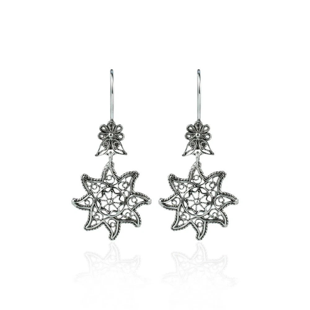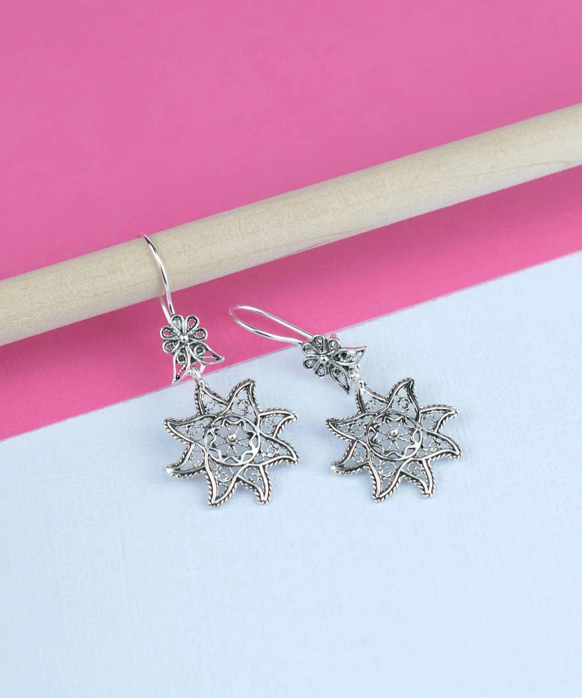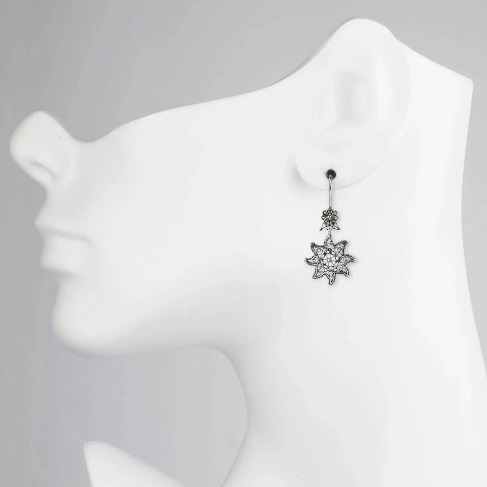 Looking for a stunning pair of earrings that will elevate any outfit? Look no further than these Filigree Art Star Figured Women Sterling Silver Dangle Drop Earrings. These earrings are handcrafted from high-quality 925 sterling silver and feature intricate filigree art detailing. The star design adds a touch of glamour and sparkle, making these earrings the perfect accessory for any special occasion or evening event. The drop style of the earrings creates a bold and striking look that is sure to turn heads. They are lightweight and comfortable to wear, so you can keep them on all night long. These earrings make a great gift for any fashion-forward woman in your life or a special treat for yourself. They come in a beautiful velvet pouch, making them easy to store and perfect for gift-giving. Filigree Art is an ancient jewelry-making technique that involves twisting and bending thin strands of metal into intricate designs. It is a timeless art form that adds elegance and sophistication to any piece of jewelry. These earrings are a perfect example of the beauty and craftsmanship of Filigree Art. Order now and add a touch of sophistication to your jewelry collection with these gorgeous Filigree Art Star Figured Women Sterling Silver Dangle Drop Earrings.