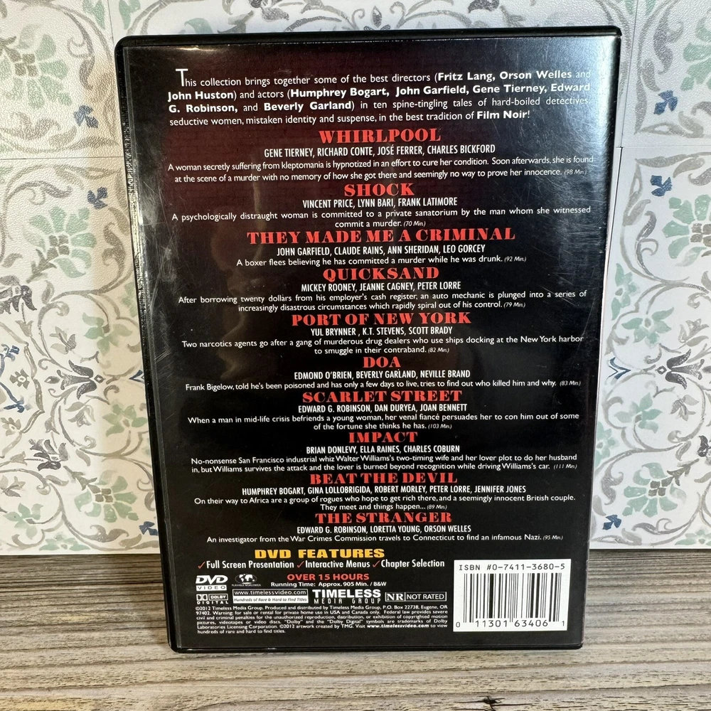 This DVD collection features ten classic films that are sure to captivate any movie lover. With a mix of tall/DVD cases, the collection includes films featuring renowned actors such as Edward G. Robinson, Gene Tierney, John Garfield, Humphrey Bogart, and Orson Welles. The cinematic movement is film noir, with a rating of NR and a sub-genre of mystery/suspense. The DVD format is compatible with all regions, making it perfect for worldwide viewing. The language is English, and the director is Fritz Lang. This Timeless Media studio collection is a must-have for any film enthusiast. ---------------- Smoke-free home. Items stored in cool, dry space. Shipping We will ship your item within two business days of purchase. Combined Shipping is available and partial shipping amounts paid will be refunded when ordering more than one item within the same hour. Photos Please see photos for best description of the item’s condition. All photos are of the actual item listed for sale, unless otherwise noted. We do our best to provide proper photos and descriptions of the items to insure there are no surprises once received. Thank you for shopping Declutteringo!