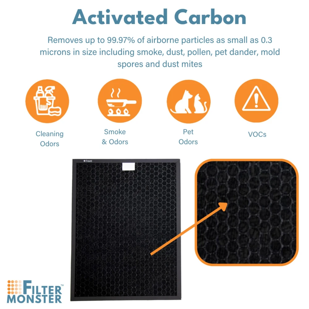 Model Compatibility: Filter-Monster True HEPA Replacement with Carbon Filter Set compatible with Coway 400/400S Airmega Max 2 filter. Engineered to fit Coway Airmega 400 and 400S air purifiers. Activated Carbon: The Filter-Monster HEPA Replacement Air Filter has integrated carbon that reduces household odors and VOCs (volatile organic compounds) from cooking, cleaning chemicals, and smoke. True HEPA filtration: HEPA filter replacement captures up to 99.97 percent of particles as small as 0.3 microns including smoke, dust, pollen, pet hair and dander, mold spores, and dust mites. Improve the air quality in your home all year round. Replacement Time: Depending on air quality environment and usage, it is recommended to replace the HEPA filter every 12 months to help ensure the Coway Airmega air purifier is running efficiently. Dimensions: Filter-Monster True HEPA Replacement with Carbon Filter Set compatible with Coway 400/400S Airmega Max 2 filter. The air filters approximate dimensions are: 14.37" x 11.02" x 1.77”. Included in the package are two (2) replacement filters.