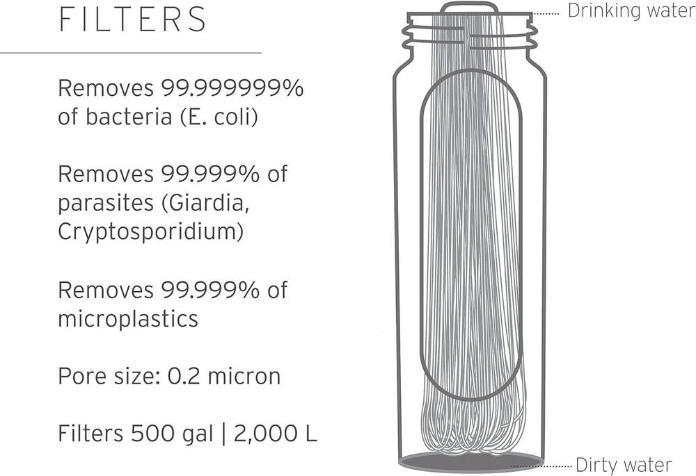 Filtro de agua 1L, ultracompacto y versátil, gris oscuro Durabilidad extrema US Protege contra el 99,999999 % de las bacterias (incluidas E. coli, Salmonella), el 99,999 % de los parásitos (incluidos Giardia y Cryptosporidium), el 99,999 % de los microplásticos, el cieno, la arena y la turbiedad Rendimiento mejorado del microfiltro: nuestra membrana rediseñada y el accesorio de retrolavado personalizado significan un mejor rendimiento contra la arena y el cieno, manteniendo un gran flujo a largo plazo Ultracompacto, nuestro filtro reconfigurado es pequeño pero poderoso con un kit súper empacable que no sacrifica el peso ni el espacio Extrema durabilidad: los materiales de primera calidad 2 veces más gruesos lo hacen más resistente y ultra a prueba de fugas Altamente versátil significa que el sistema de botella exprimible plegable está diseñado teniendo en cuenta cada ocasión; úselo como botella, exprima agua a través de ella en recipientes para cocinar u otros artículos para beber, úselo como pajita, retire el filtro para usarlo como un sistema de almacenamiento o conéctelo a otros sistemas de la serie Peak